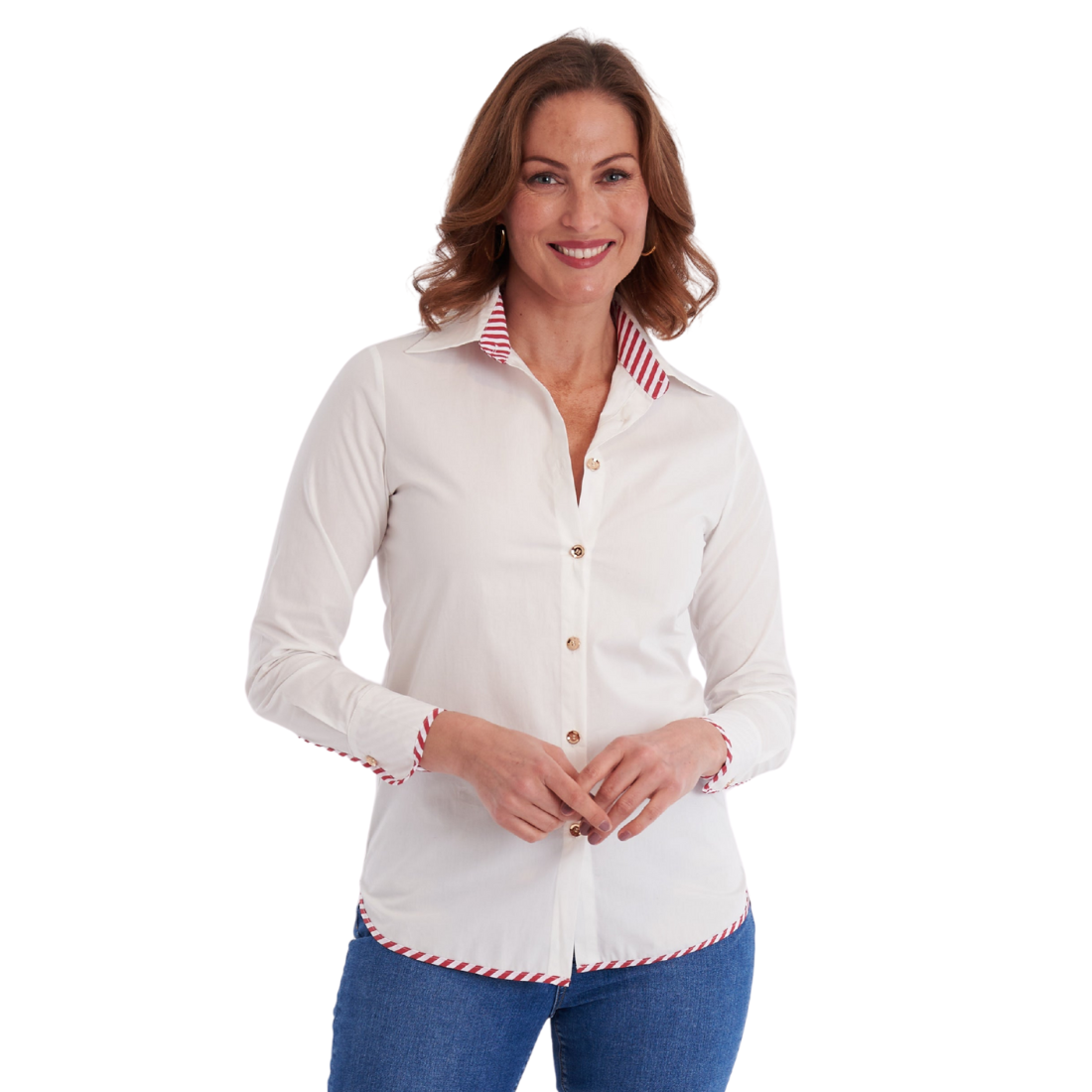 The Bryson Button Down in White/Mulberry Stripe puts a playful spin on a classic look. Featuring clean, crisp white fabric with gold buttons and peek-a-boo striped cuffs, this shirt adds a fun surprise to your everyday style. Perfect for mixing timeless elegance with a touch of whimsy.