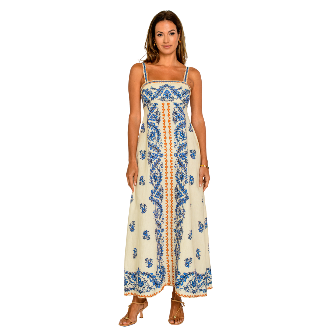 Embrace effortless charm with the Elizabeth James Annalisa Dress, featuring a playful rust and blue handkerchief print. This linen maxi dress is perfect for sunny days and outings, dress her up or down! Its flowing silhouette ensures comfort while turning heads with every step.