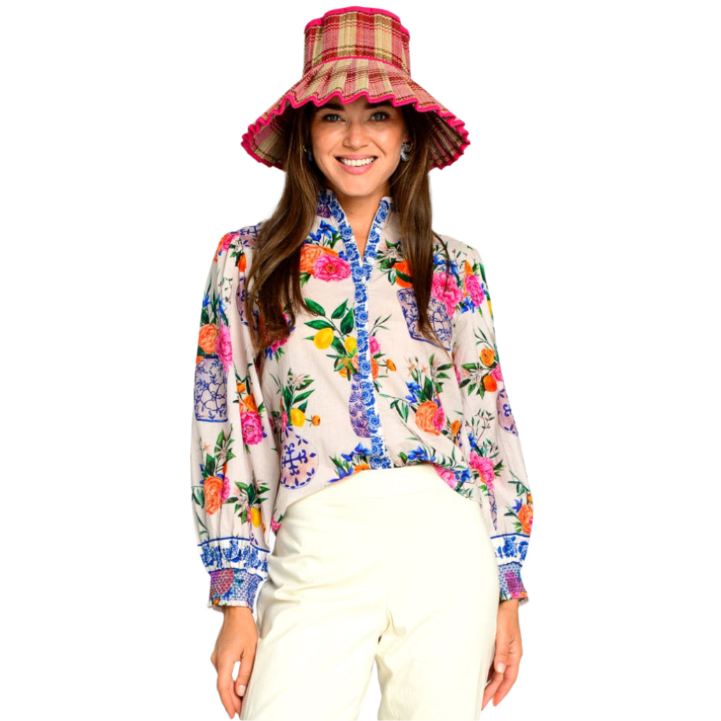 Cut from a light linen blend fabric, the Emily Top is the perfect button-down to dress up or down this season. She features a mandarin collar, covered placket, and balloon sleeves, all adorned with piping and decorative stitching. In the perfect print, Ivory Ginger Jars for summer!