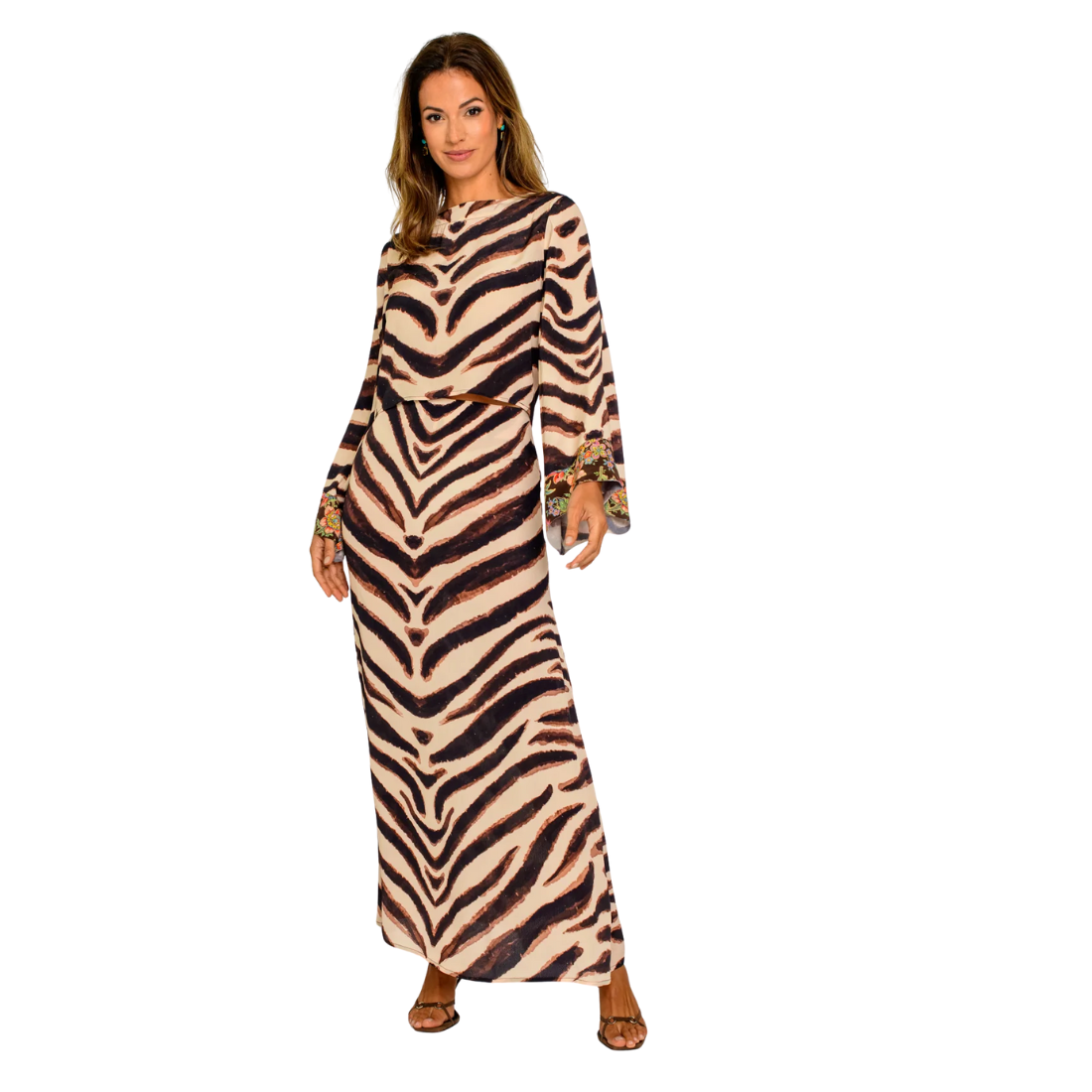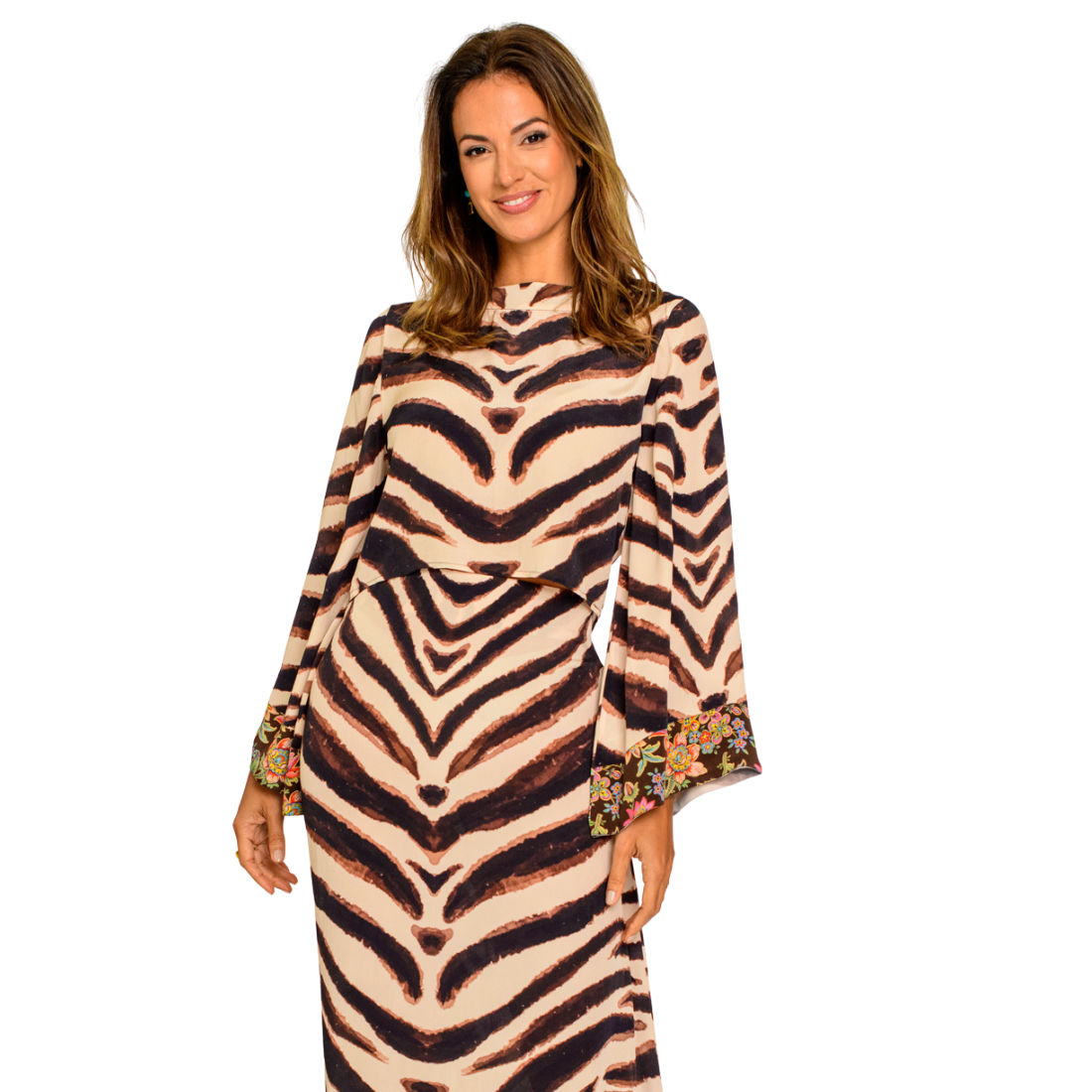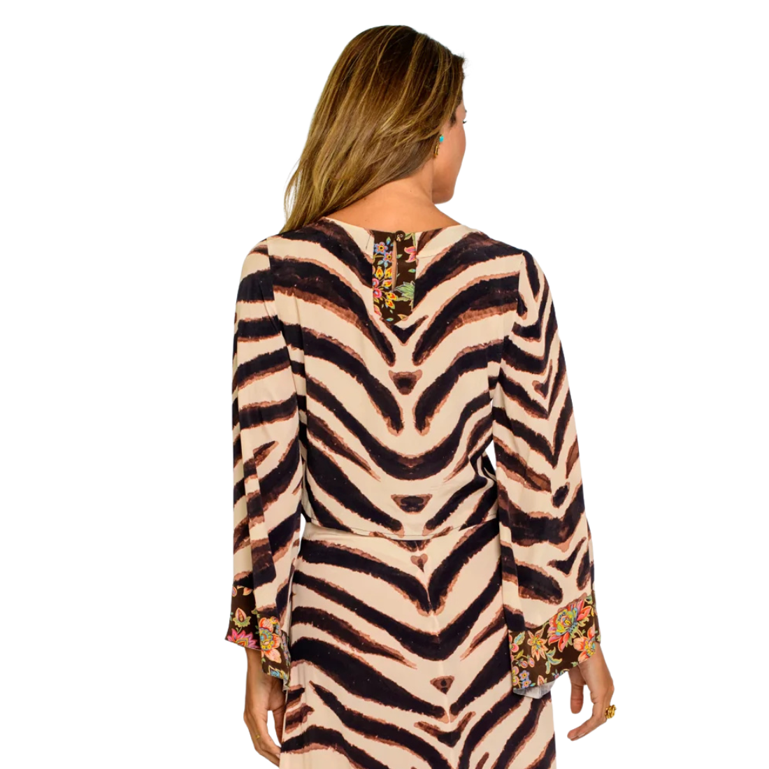 Light and versatile, Gia is a great pick for a Fall wardrobe addition. She features bell sleeves with a decorative border print and a chic, waist length hem. Dress her up or down with your favorite jeans or skirts.