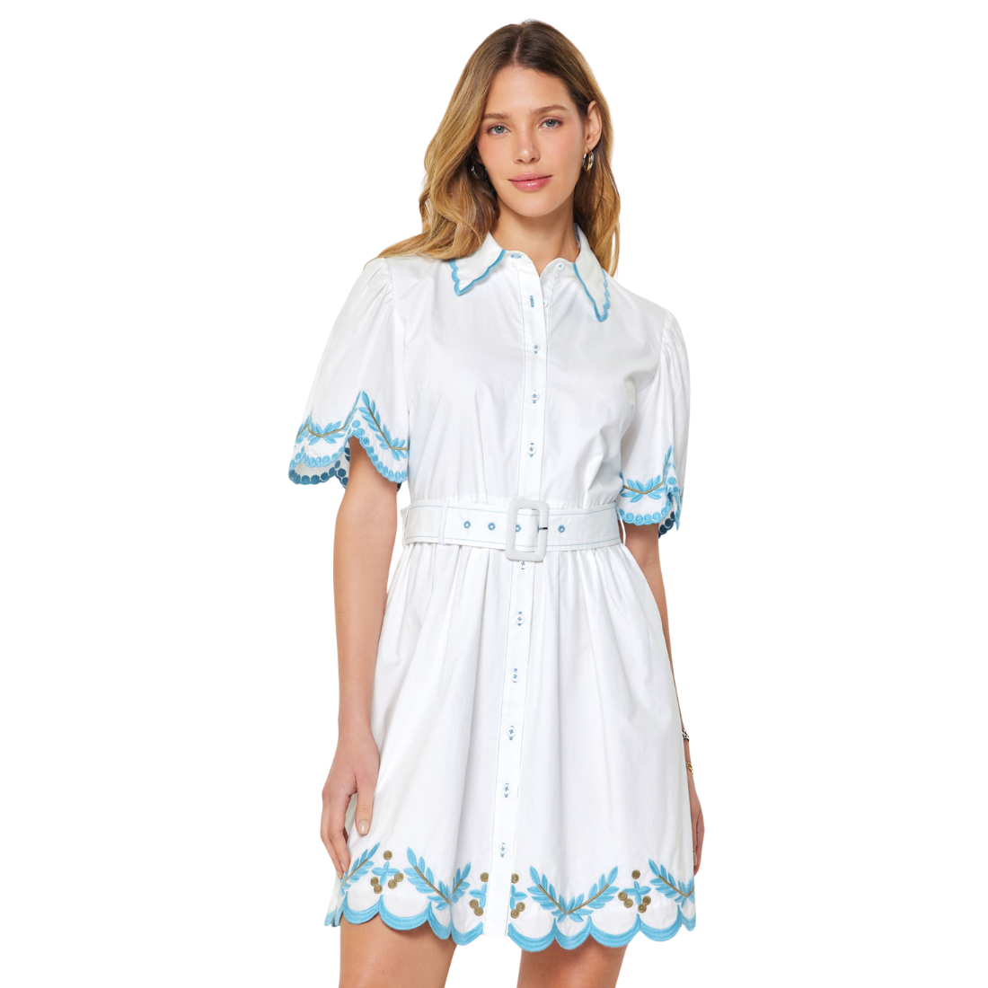 Charming cotton dress featuring a scalloped-edge collar and short sleeves for a delicate, feminine touch. The front button-down placket offers easy styling versatility, while the mini-length skirt showcases a matching scalloped hem and practical side pockets. Includes a coordinating buckle belt and soft lining for comfort. Crafted from 100% cotton for breathability and ease of care—simply machine wash on gentle cycle in cold water. Perfect for casual outings or dressed-up occasions.