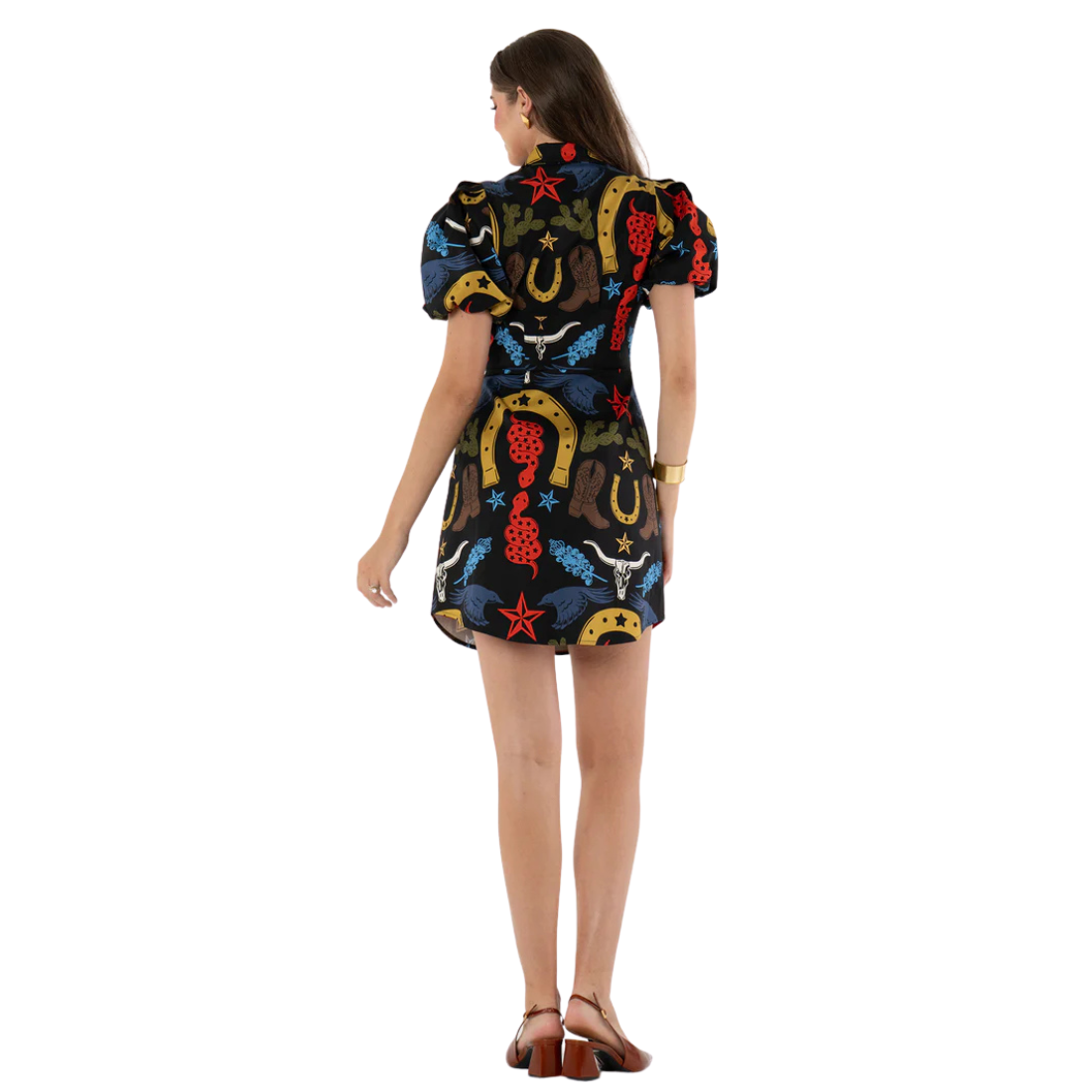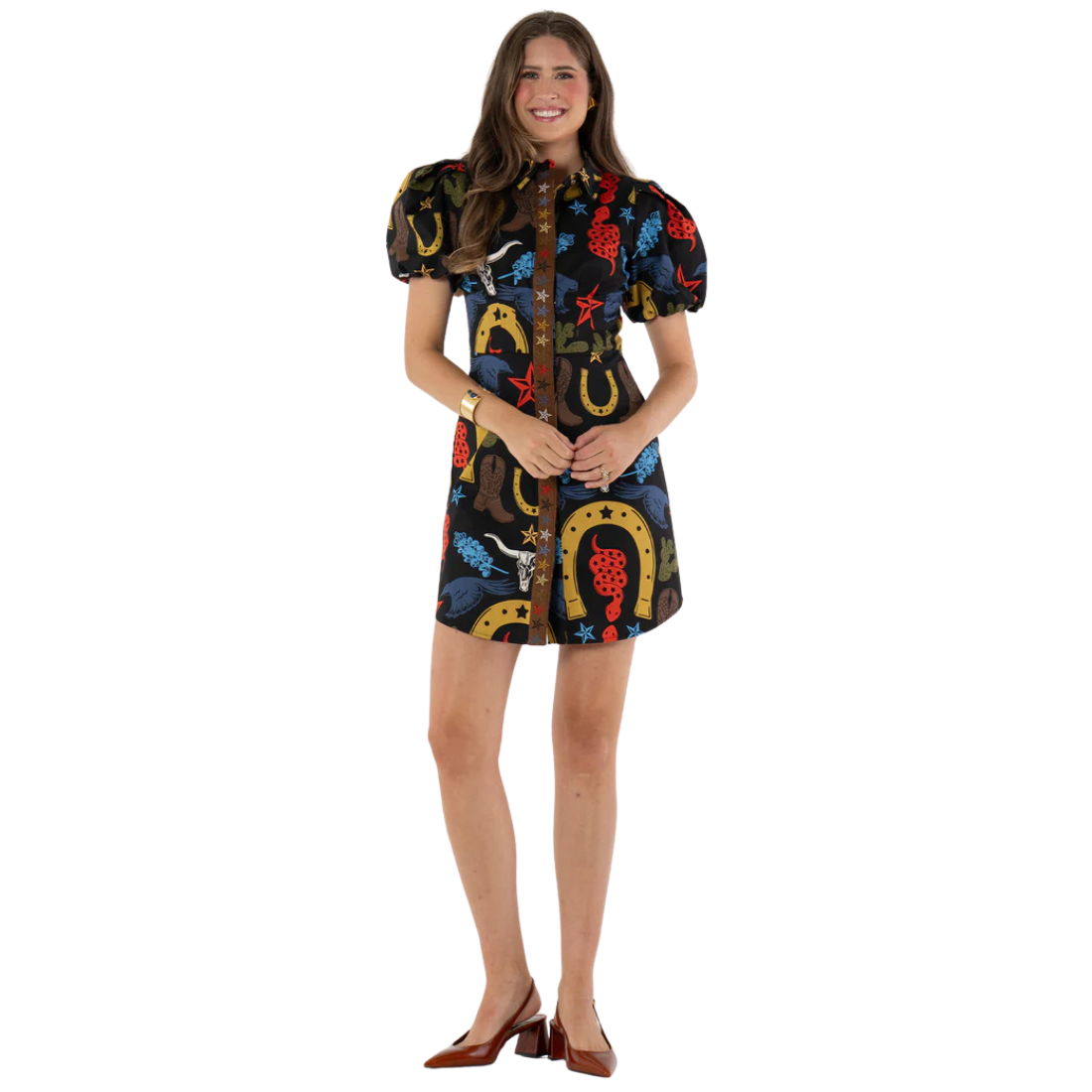 The Britt Dress in Lone Star features a tailored silhouette with a button-front closure, classic fold-over collar, puff sleeves, and a shirttail hem that adds a touch of ease to the structured fit. The Lone Star print is a bold tribute to Texas heritage, showcasing western iconography like horseshoes, longhorns, cowboy boots, and desert florals in striking fall tones. A standout multicolor embroidered trim runs along the front placket, adding rich texture and dimension while concealing the button closure. Finished with thoughtful detailing, this mini is designed to make a statement with playful edge and timeless western character.