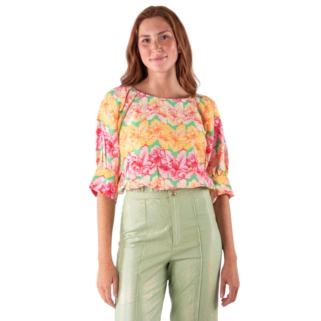 The Celeste Crop has volume and flair with sweet blouson sleeves adding a touch of style to any pairing. The bubble hem hits perfectly below the natural waistline for the effortlessly styled faux tuck look, a perfect length to pair with both high waisted and mid rise bottoms.