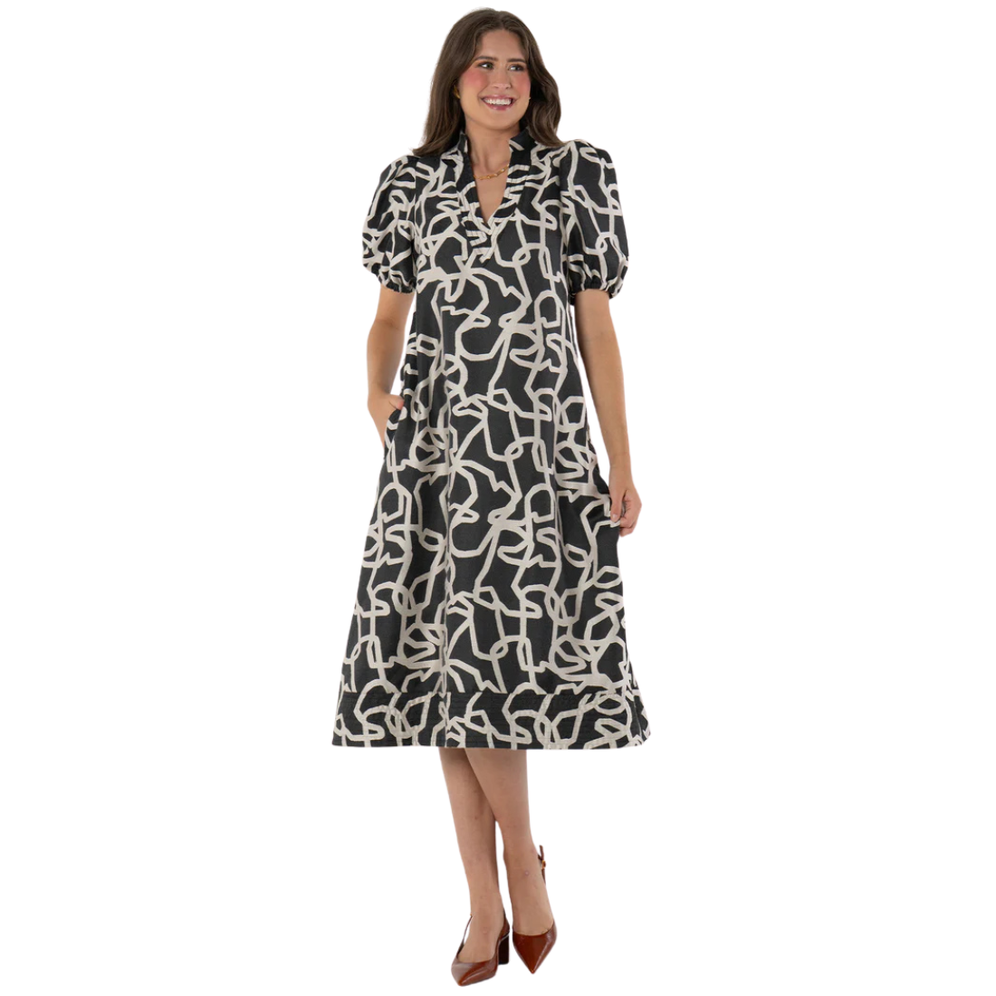 The Hampton Dress in Boot Print showcases an abstract pattern created from interlocking boot outlines, a nod to western heritage reimagined with modern flair. The black and ivory woven fabric adds soft texture and visual dimension, giving the design depth and character. This midi-length silhouette features a mandarin collar, V-neckline, puff sleeves, and a trapunto-stitched hem, finished with functional side seam pockets for effortless wear.