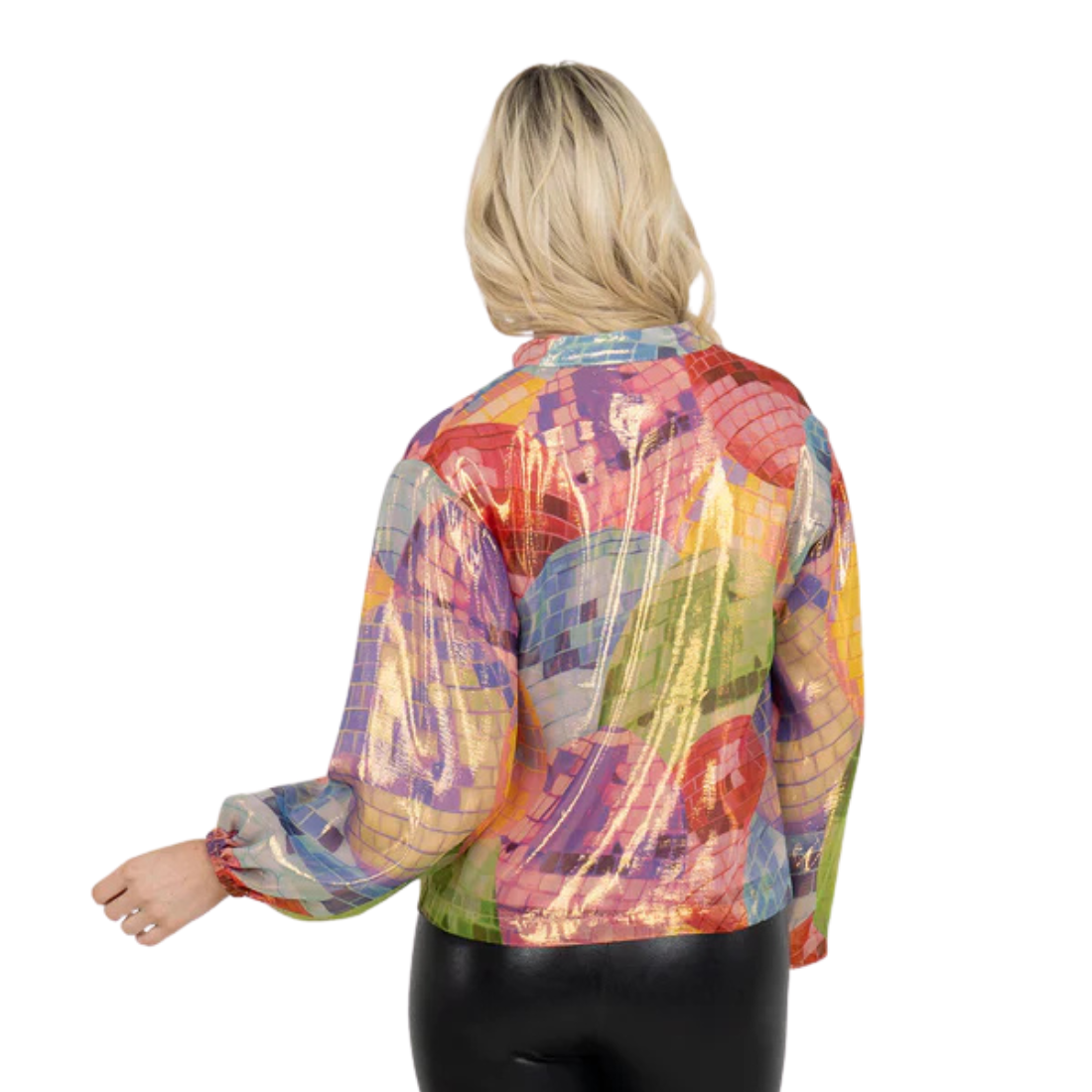 The Lolli Top in Disco features a notched neckline, relaxed blouson sleeves with gathered cuffs, and a loose, easy silhouette. Metallic threads are woven through rich silk, creating a luminous, reflective finish that catches the light with every movement. The iridescent surface evokes the brilliance of a spinning disco ball, making this top a true statement piece designed to shine.