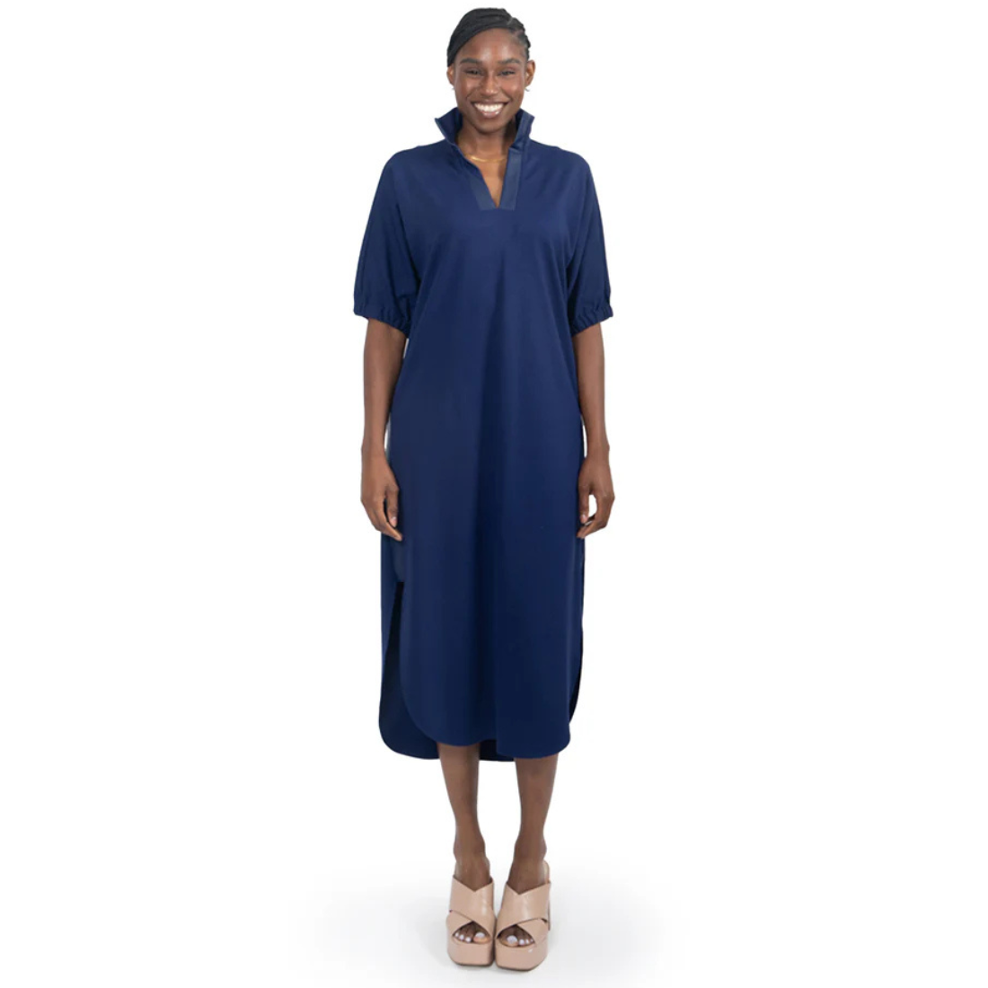The Poppy Caftan is Emily McCarthy's best-selling silhouette now available in our best selling ponte fabric that provides comfortable softness and supportive stretch. The Poppy Caftan is most loved for it's relaxed and effortless silhouette that can easily translate from casual wear to cocktails. Featuring loose elastic dolman sleeves, optional stand collar, and leather trim detailing that finishes with a chic curved tail hem.