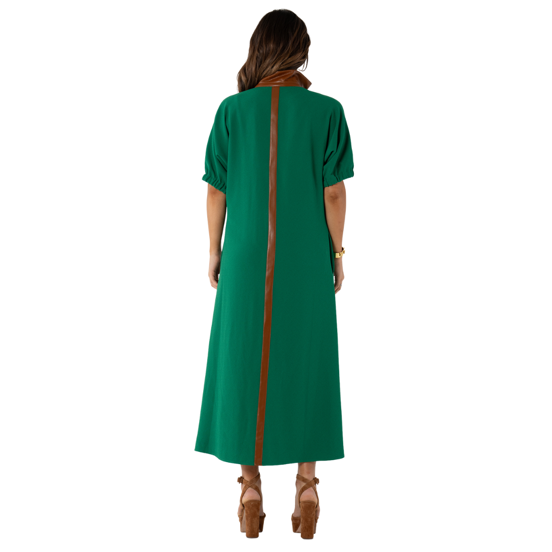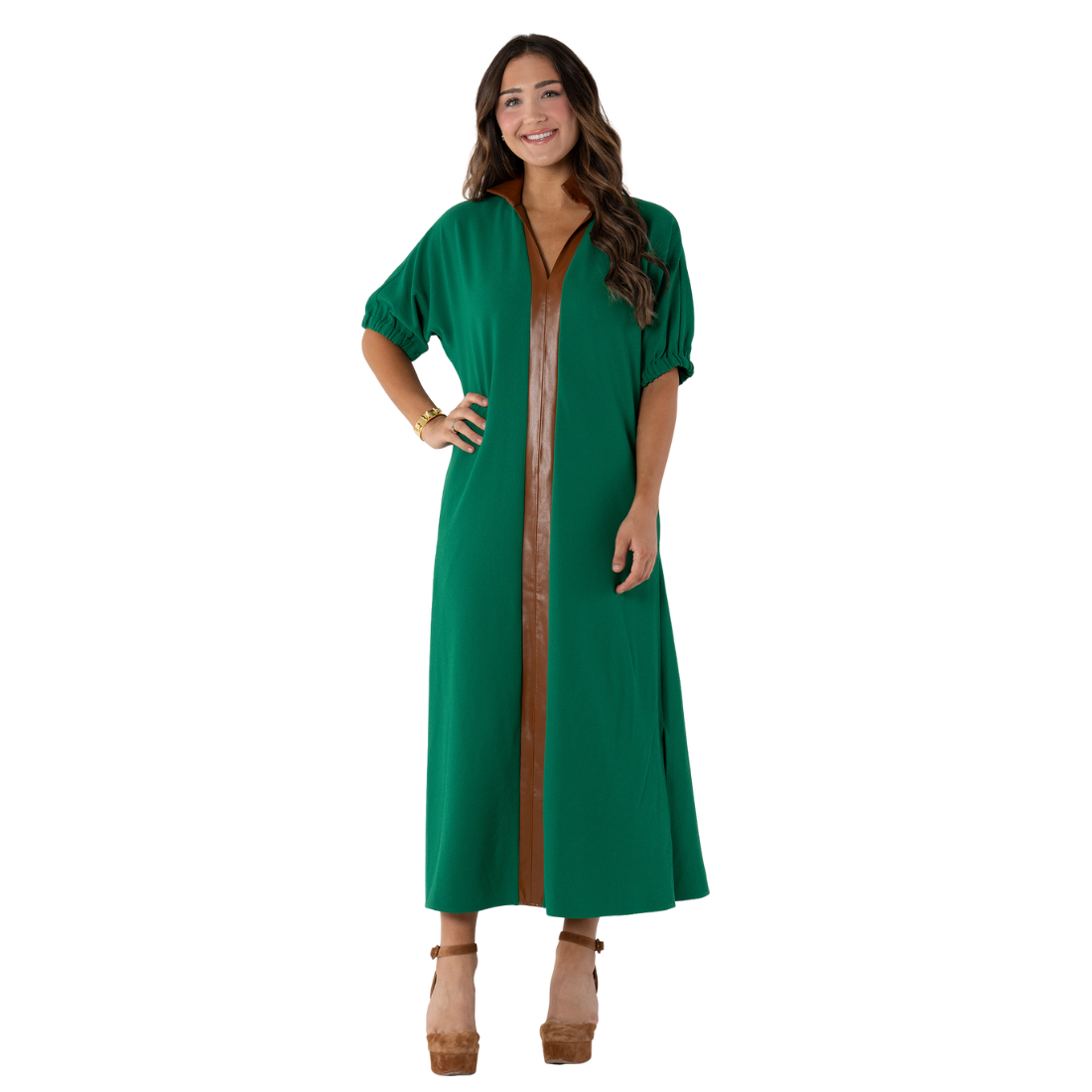 The Poppy Maxi in Green Jacket features a classic stand collar and loose elastic dolman sleeves for a relaxed yet elevated look. Designed with side pockets and a flowing, easy silhouette, this style is accented by a vegan leather stripe that runs along the front, back, and stand collar for a sleek, modern finish.