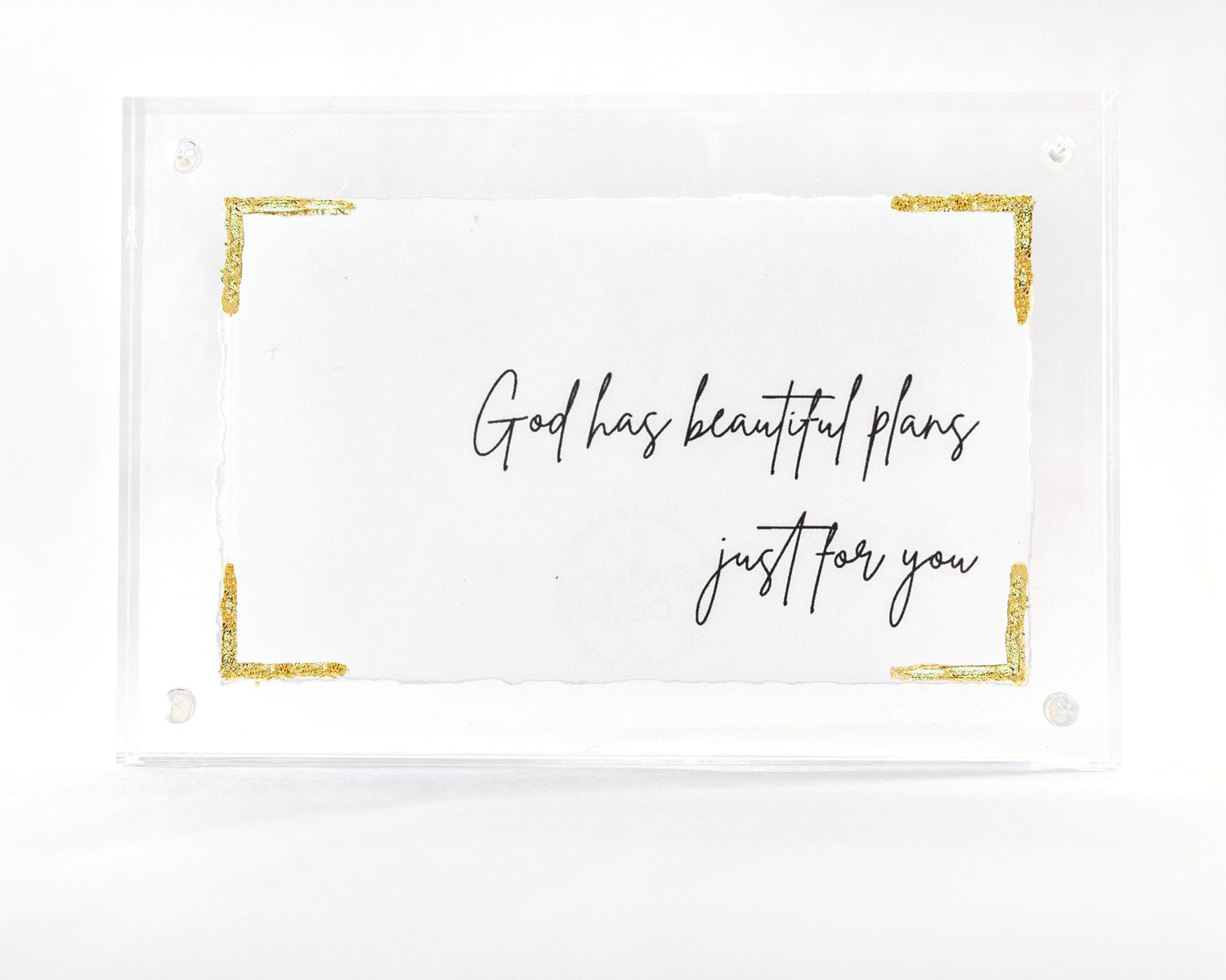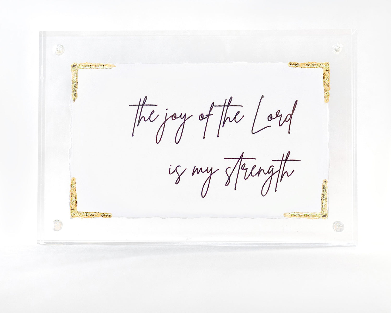 each piece is handmade and features beautiful recycled paper with torn edges, hand-scripted style lettering in black, elegant gold leaf corners & displayed in a stunning, high-quality acrylic frame.