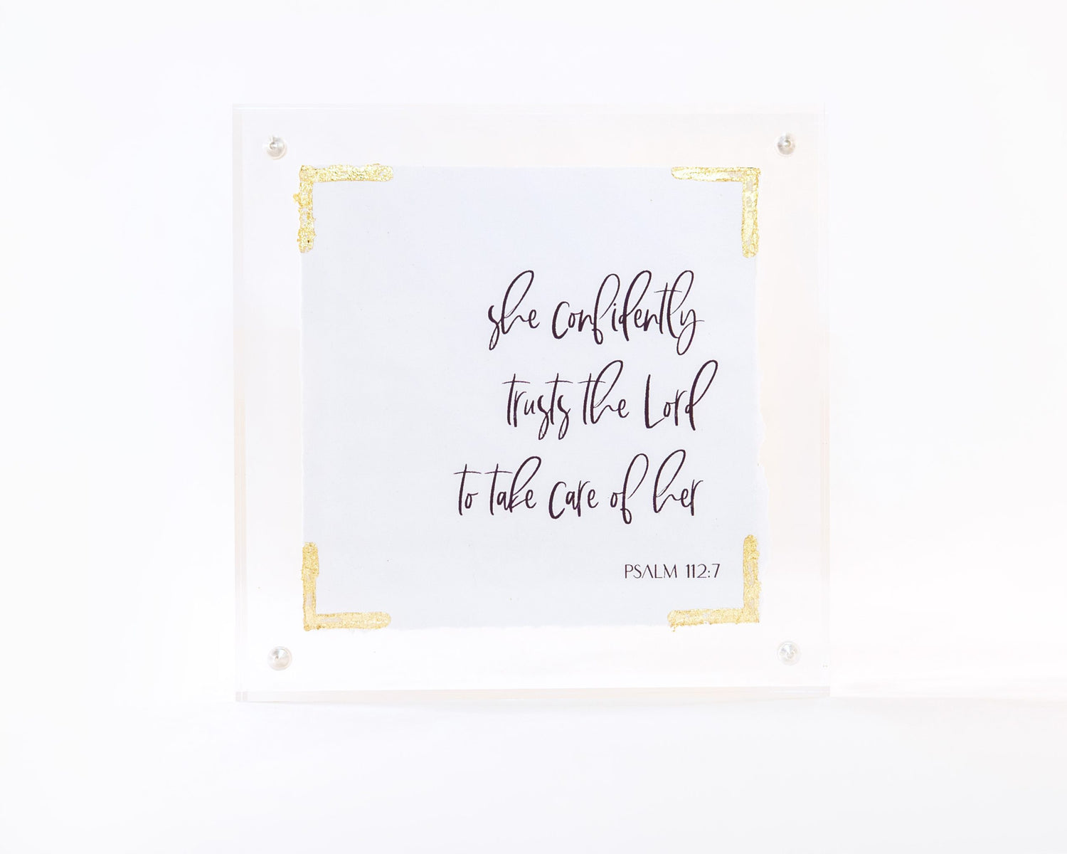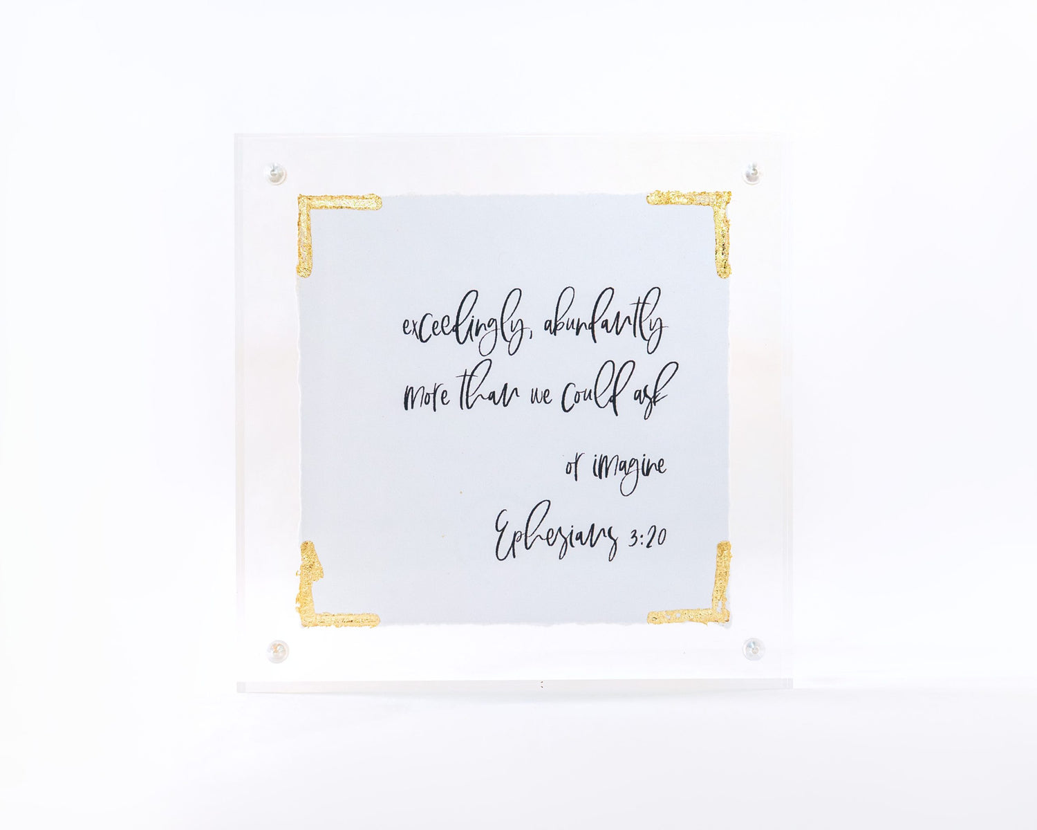 each piece is handmade and features beautiful recycled paper with torn edges, hand-scripted style lettering in black, elegant gold leaf corners & displayed in a stunning, high-quality acrylic frame.