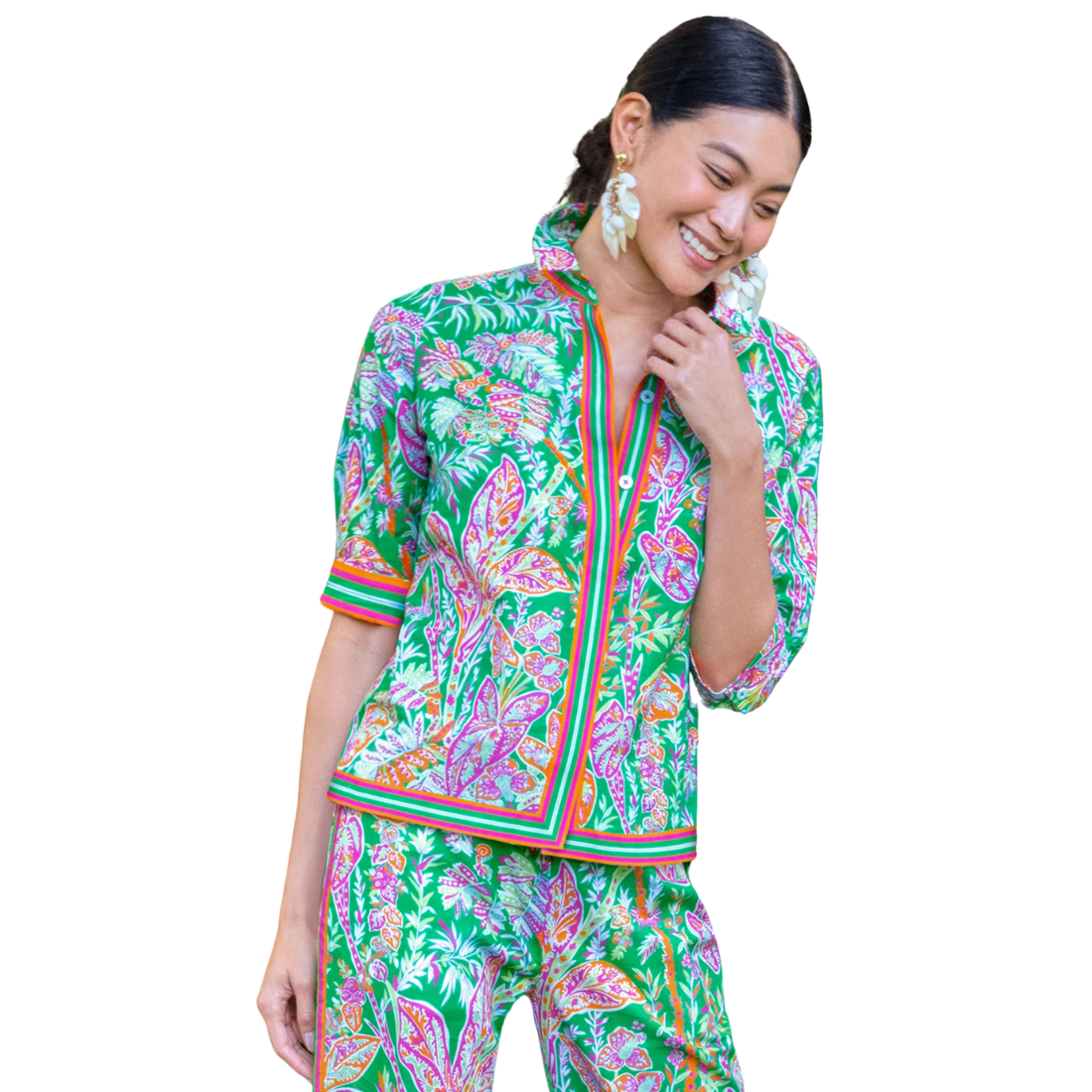 This top by Gretchen Scott is true to its namesake, effortless! With a fun print, this top is perfect for spring and summer. It can be worn buttoned or unbuttoned for a layered look. 100% cotton.