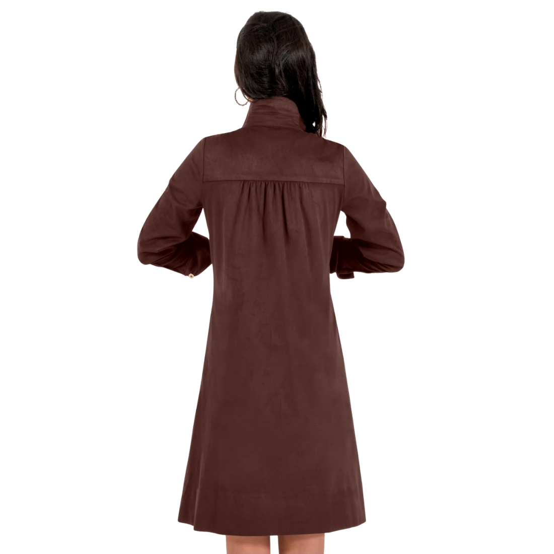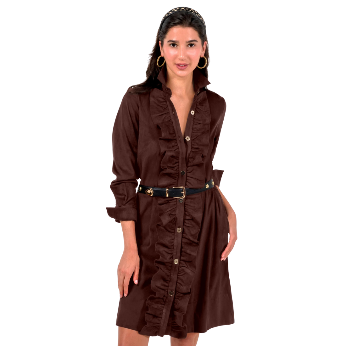 Step out in style with the Gretchen Scott Ruffle Rumble Dress in rich espresso ultra suede. Featuring a structured ruffle front placket and shiny gold buttons, this dress brings playful elegance to your look. Practical side seam pockets add convenience without sacrificing charm, while the turn-back cuffs with gold button closures provide a fun finishing touch. Perfect for days when you want to dazzle with a dash of sophistication!