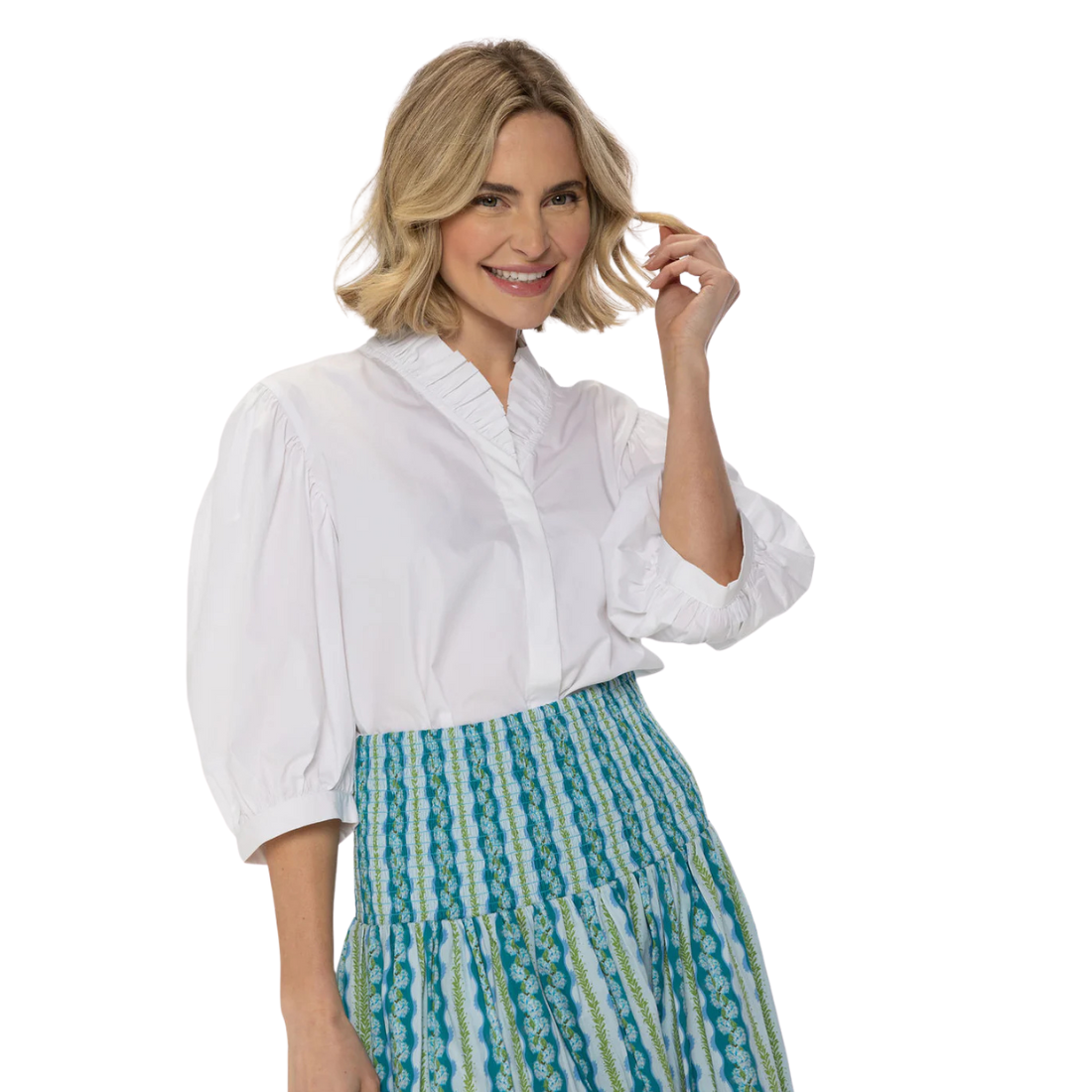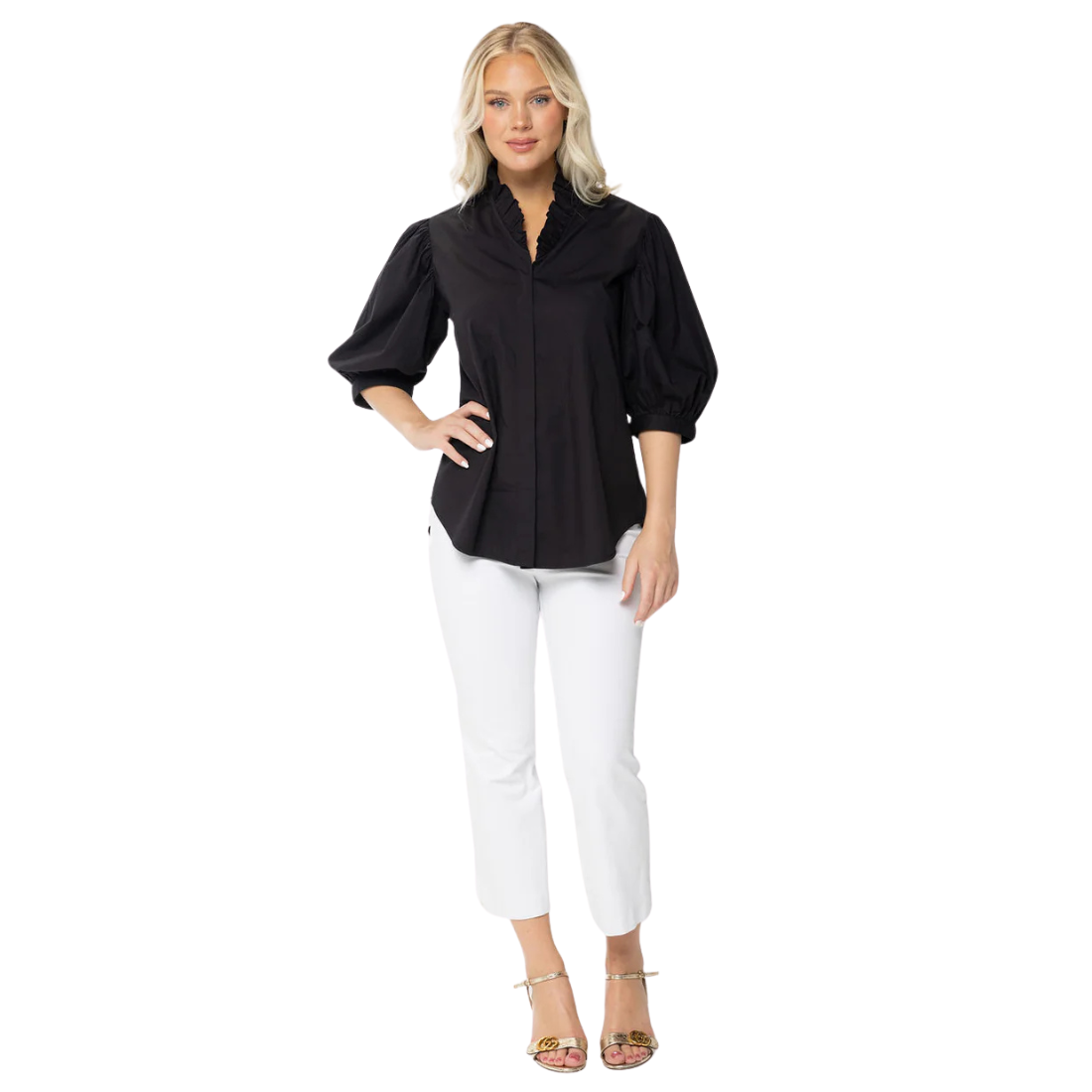 This Holly Shae blouse features a ruffled stand collar, covered placket and pleated sleeves.