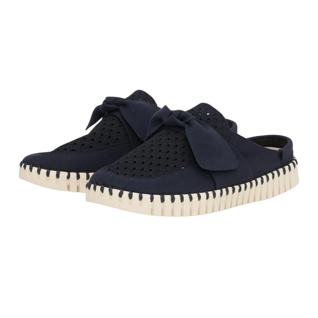 A slip-on Tulip shoe in a loafer style featuring a bold bow on top. Crafted from recycled microfiber, it rests on a flexible Tulip outsole, stitched with matching recycled thread. Inside, a soft, padded insole ensures comfort and support.