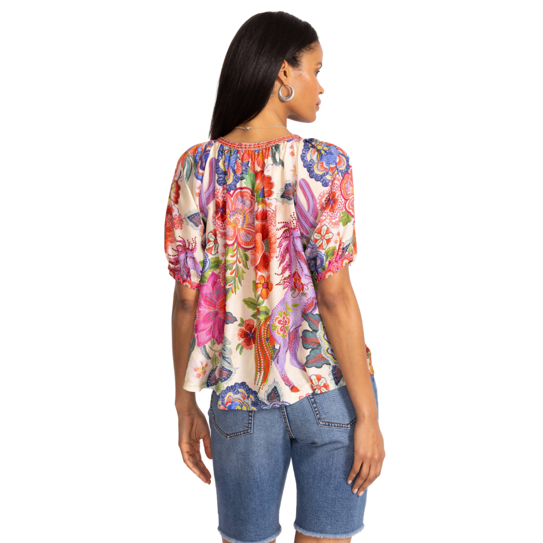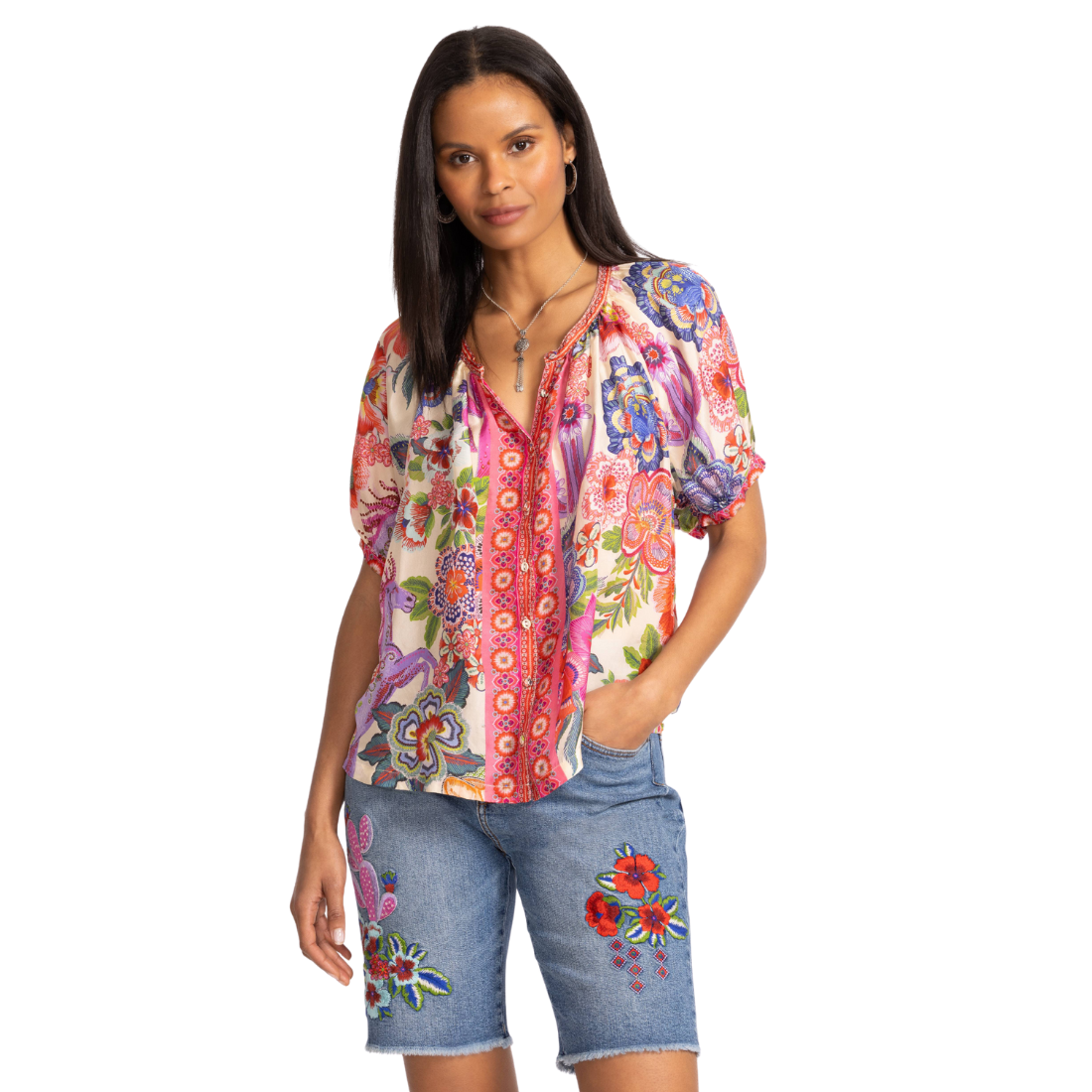 Crafted from 100% luxurious silk, the Avah Button Down Shirt is adorned with a bold floral pattern rich in color. Designed with a rounded neckline and gently puffed elbow-length sleeves, this relaxed-fit blouse is finished with a contrasting front placket. Pair with dark wash denim and coordinating flats for an elevated casual ensemble.