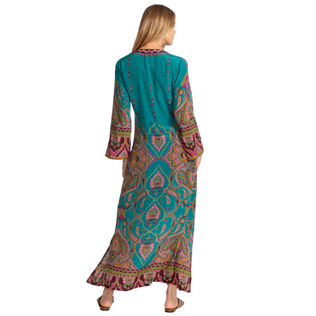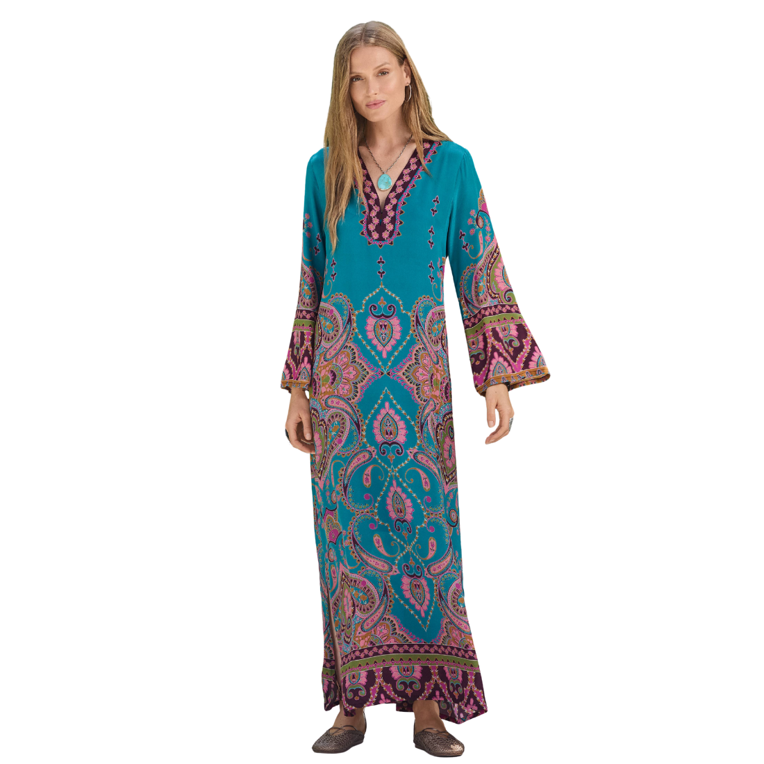 Crafted from 100% flowing silk, the Judith Dress is adorned with an ornate pattern washed in rich color. Designed with a split V-neckline and bell sleeves, this slip-lined dress is finished with side slits and contrasting accents at the hemline. Pair with strappy heels and statement jewelry for a bold, eclectic look.