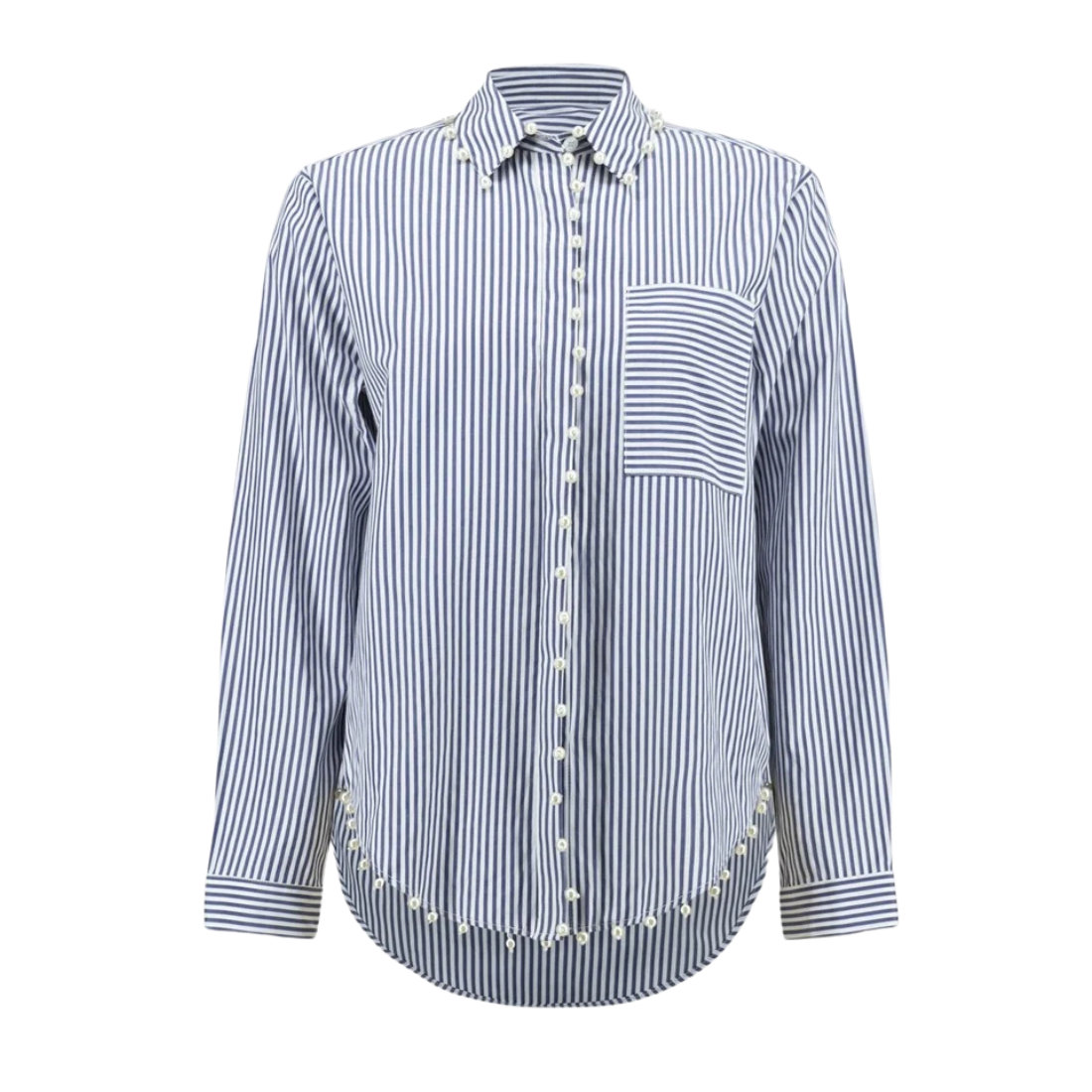 No closet would be complete without a classic striped button-down shirt. This versatile piece offers a touchably soft stretch cotton fabric, a flattering high-low hem, and feminine pearl trim. Wear it casually with your favorite jeans, or dress it up with white pants and statement jewelry.