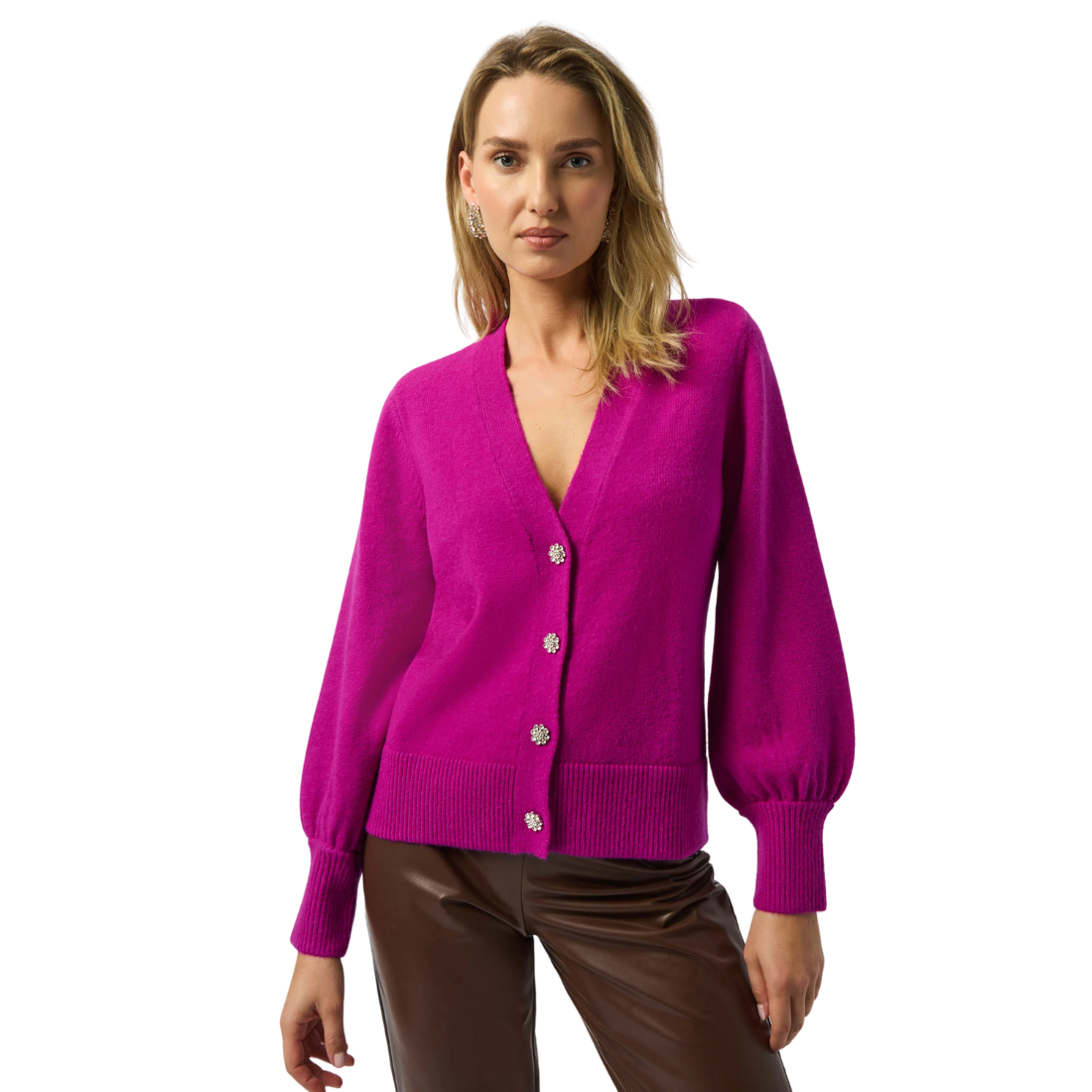 Elevate your layering game with this chic cardigan, featuring a flattering V-neckline, long puff sleeves, and dazzling rhinestone buttons for a touch of glamour. Crafted from a soft sweater knit, it offers a straight silhouette that combines effortless style with cozy comfort. Perfect for pairing with high-waisted jeans or a sleek pencil skirt for an effortlessly polished look.