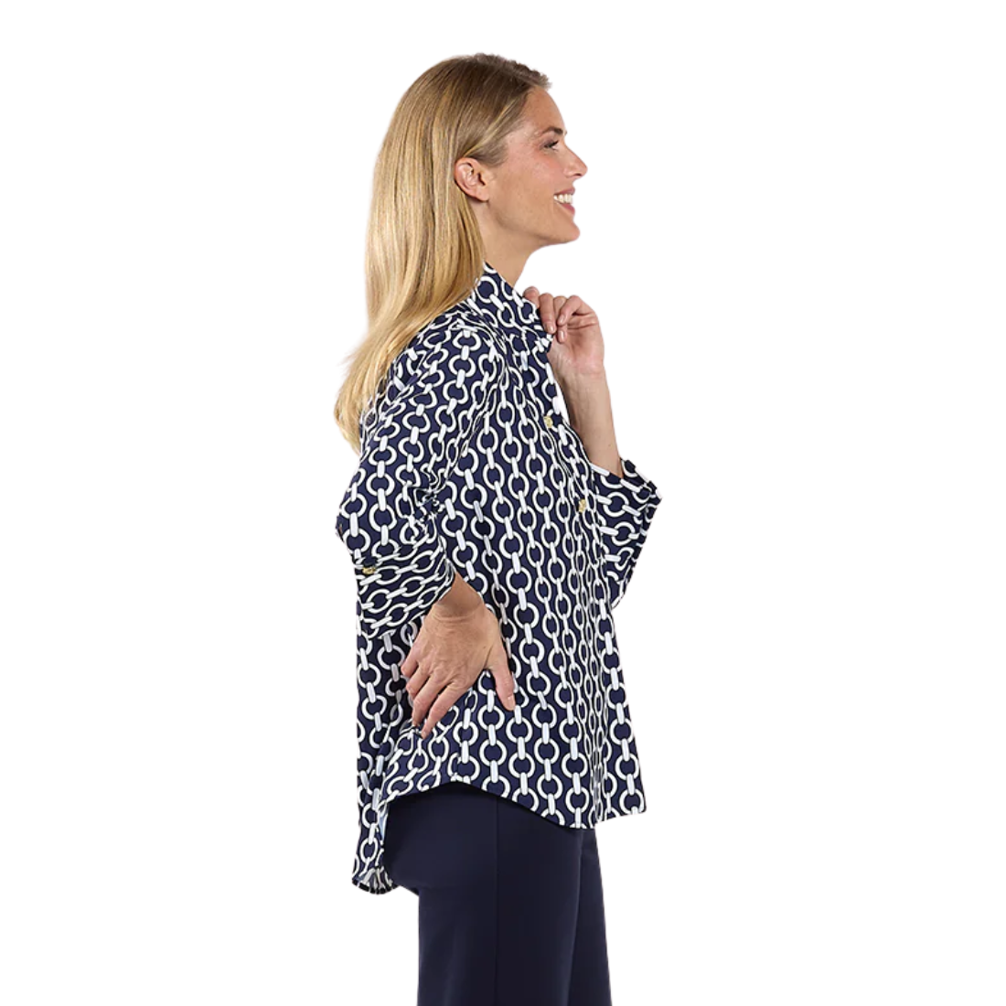 Introducing our new pull over top, Belinda! This stylish and comfortable top features a chic stand collar, 3/4 length sleeves, a shirt tail hem, and our signature gold JC buttons. Effortlessly combining elegance and ease making it a great addition to your wardrobe.