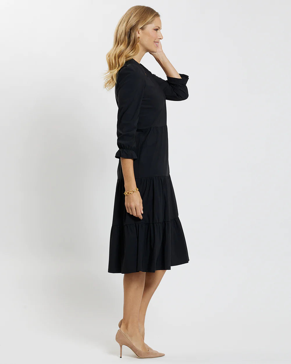 We're head over heels for the Maggie dress! One of our newest styles. It is a tiered midi dress with a V-neckline and features a feminine flutter smocked cuff sleeve. It is the perfect dress for any occasion.