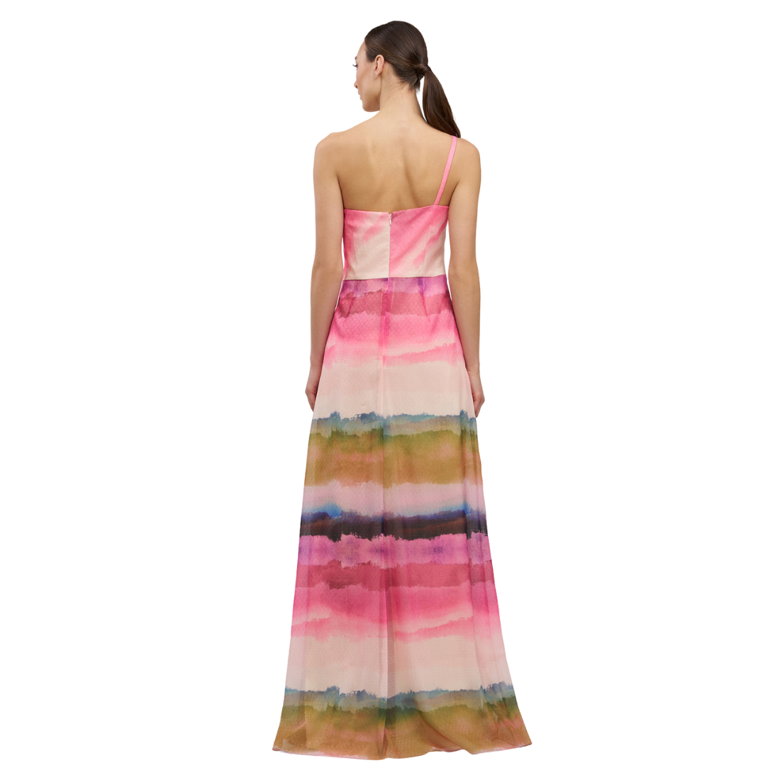 Crafted in a soft, subtly shimmering organza with an ombré stripe print, this one-shoulder gown offers a vibrant take on evening-wear. The pleated bodice wraps elegantly across the bust, leading into a flowing asymmetric silhouette that glides with movement. A perfect choice for mothers of the bride, sunset weddings, or destination soirées.