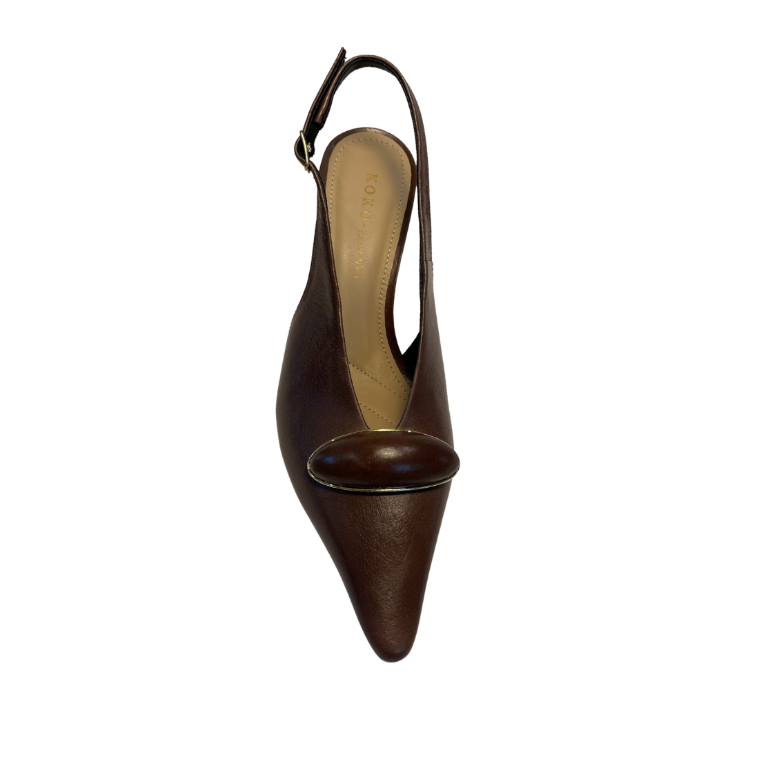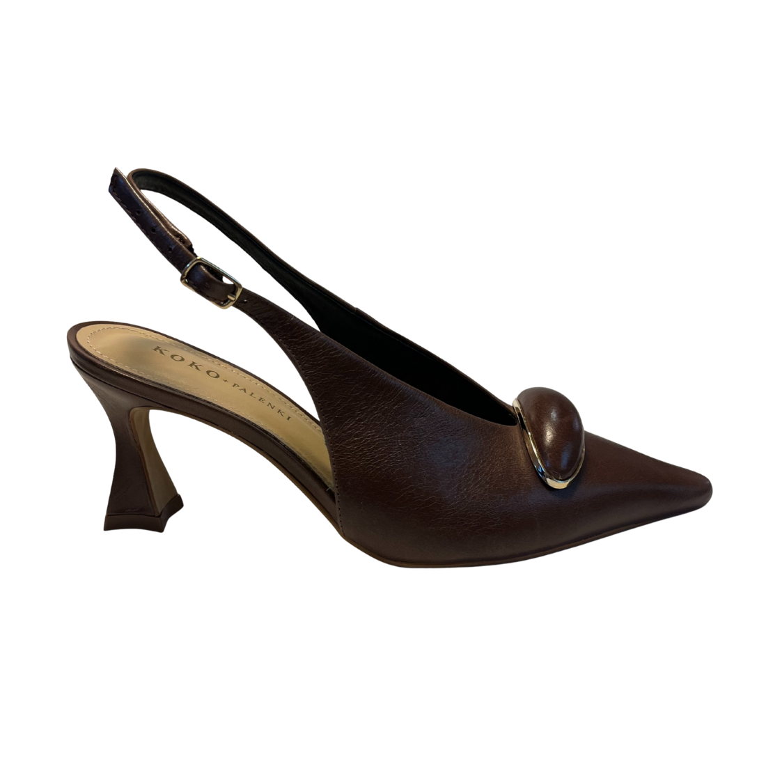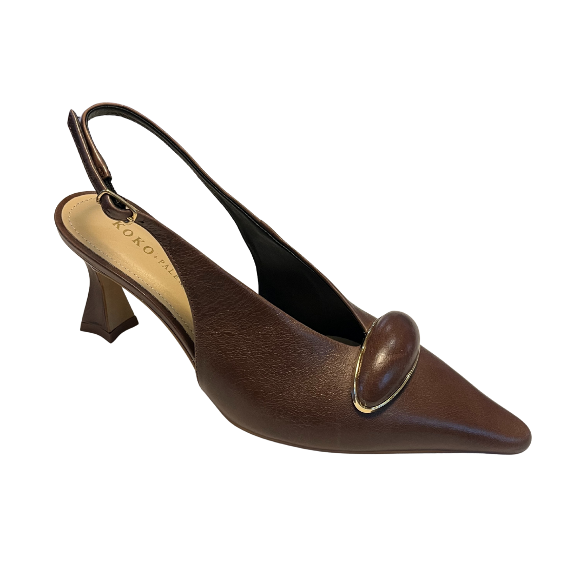 Add a playful pop to your wardrobe with the Koko + Palenki Penn Slingback. Crafted from rich brown leather, this sleek pointed-toe shoe features a fun bubble accent that brings a whimsical touch to classic sophistication. The slingback design keeps you comfortable while turning heads wherever you go.