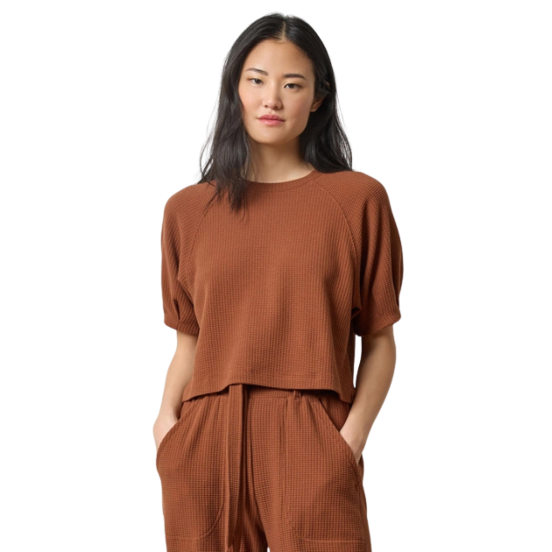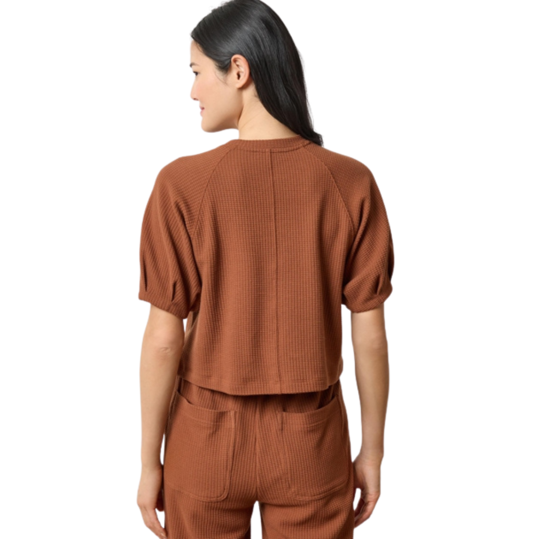 The Pleated Sleeve Top in our Textured Waffle, a customer favorite, has just the right amount of weight and a touch of stretch to hold its shape. The pleated sleeve opening adds a feminine, refined touch, while the shorter body length makes it the perfect match for the coordinating waffle pant. Casual yet elevated, this is the ideal set for running around town or travel while still looking put-together