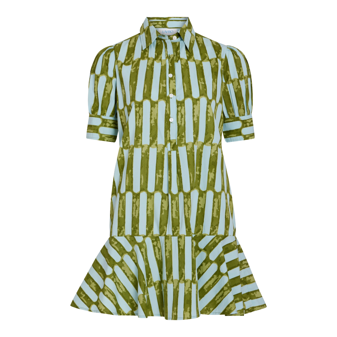 The Liv Dress is a playful mini dress with a tailored bodice and a relaxed drop-waist silhouette. It features short puff sleeves with cuff detailing, a classic shirt collar, and a partial button placket down the front. The skirt is finished with a flounced hem for a feminine, swingy shape.