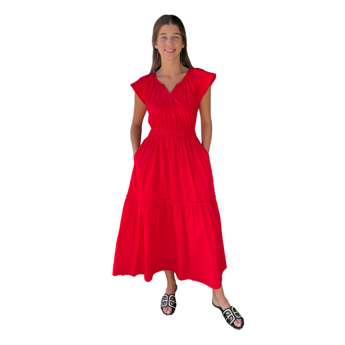 Step into effortless charm with the Maude Vivante Sierra Dress Salsa. This tiered maxi features flutter sleeves that dance with every move, a smocked waist for a flattering fit, and convenient pockets to keep your essentials close. Perfect for sunny days or breezy evenings, it blends comfort and style with a playful twist.