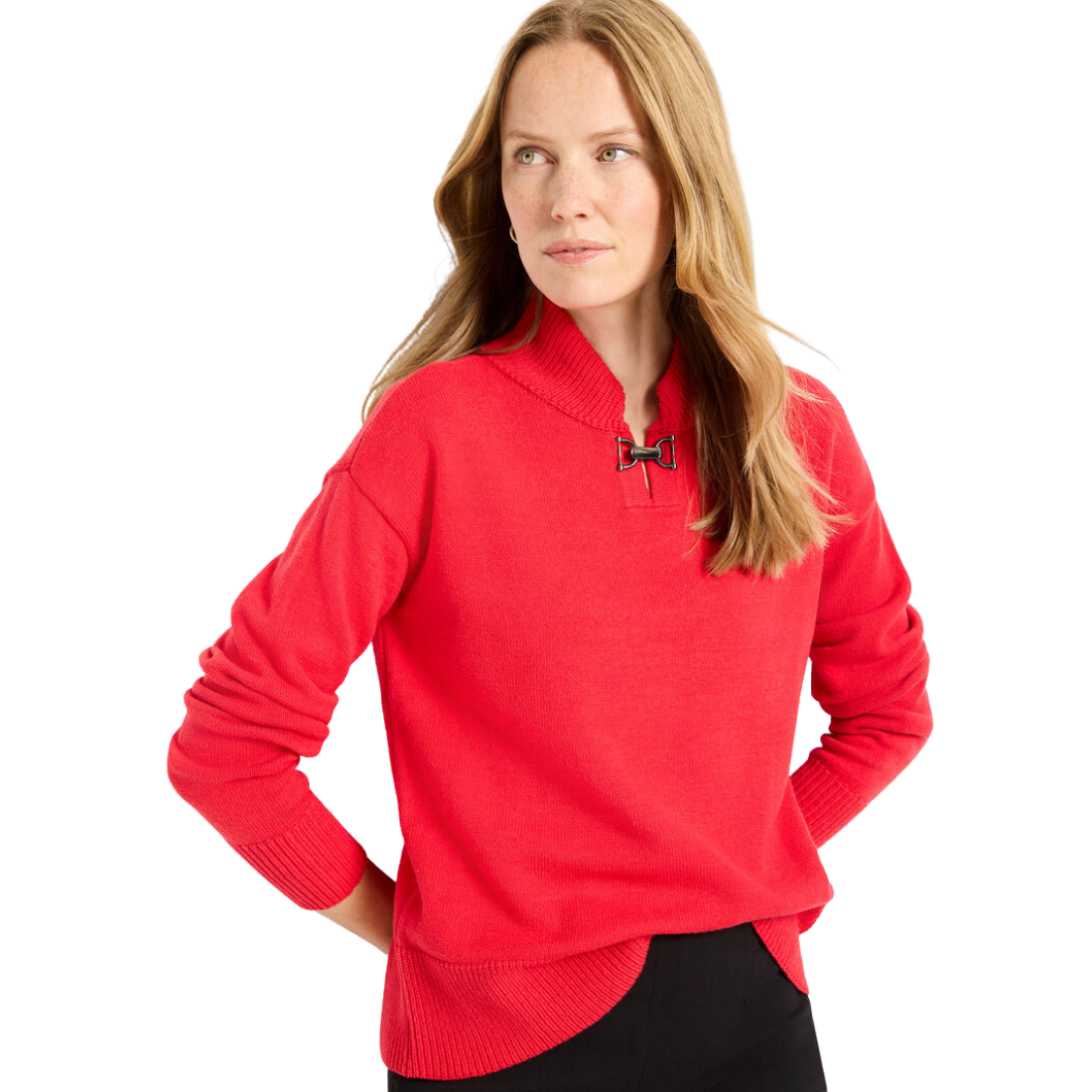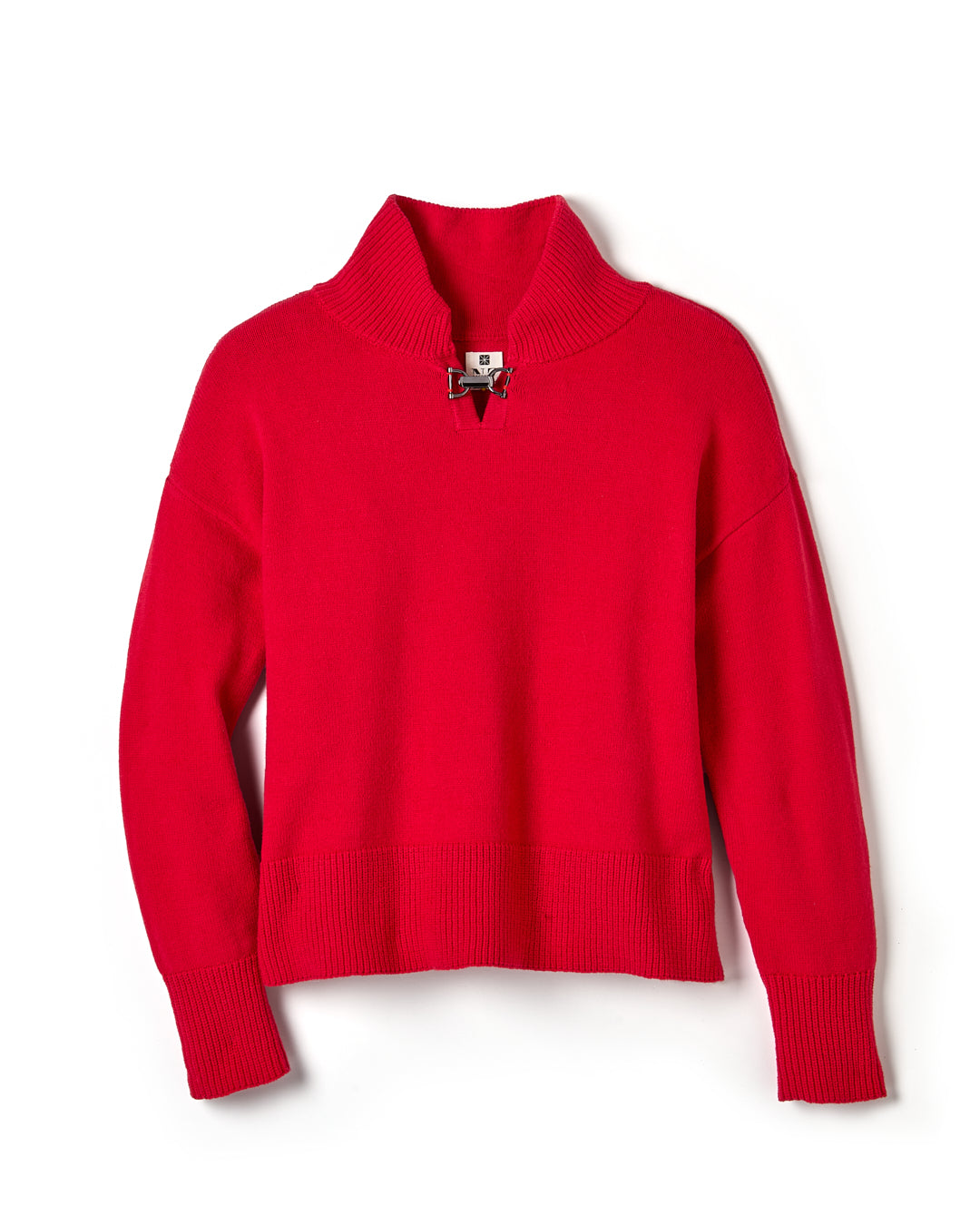 A classic look with a our modern twist. Designed with a high neck and metallic hardware at the closure, it nods to traditional riding apparel while keeping things modern and wearable. The dropped shoulders add a relaxed feel, making it perfect for cozying up or heading out. With its chic detailing and ultra-soft knit, this is the kind of casual piece that still turns heads. Effortless, polished, and ready for wherever the day takes you, whether you're leaping stone walls on horseback or stuck in rush hour traffic. Mindfully Made from fully fashioned knitwear and with cotton sourced from the world's largest cotton sustainability program.
