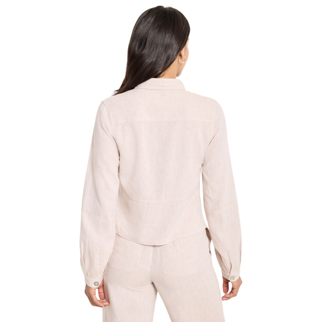 Meet utility -- refined. Designed with a relaxed, slightly cropped fit, this effortlessly cool layer balances structure and ease with a touch of modern polish. Thoughtful utility details -- oversized patch pockets, front yoke, and subtle seaming -- add dimension, while the fuller sleeve brings a soft, laid-back feel