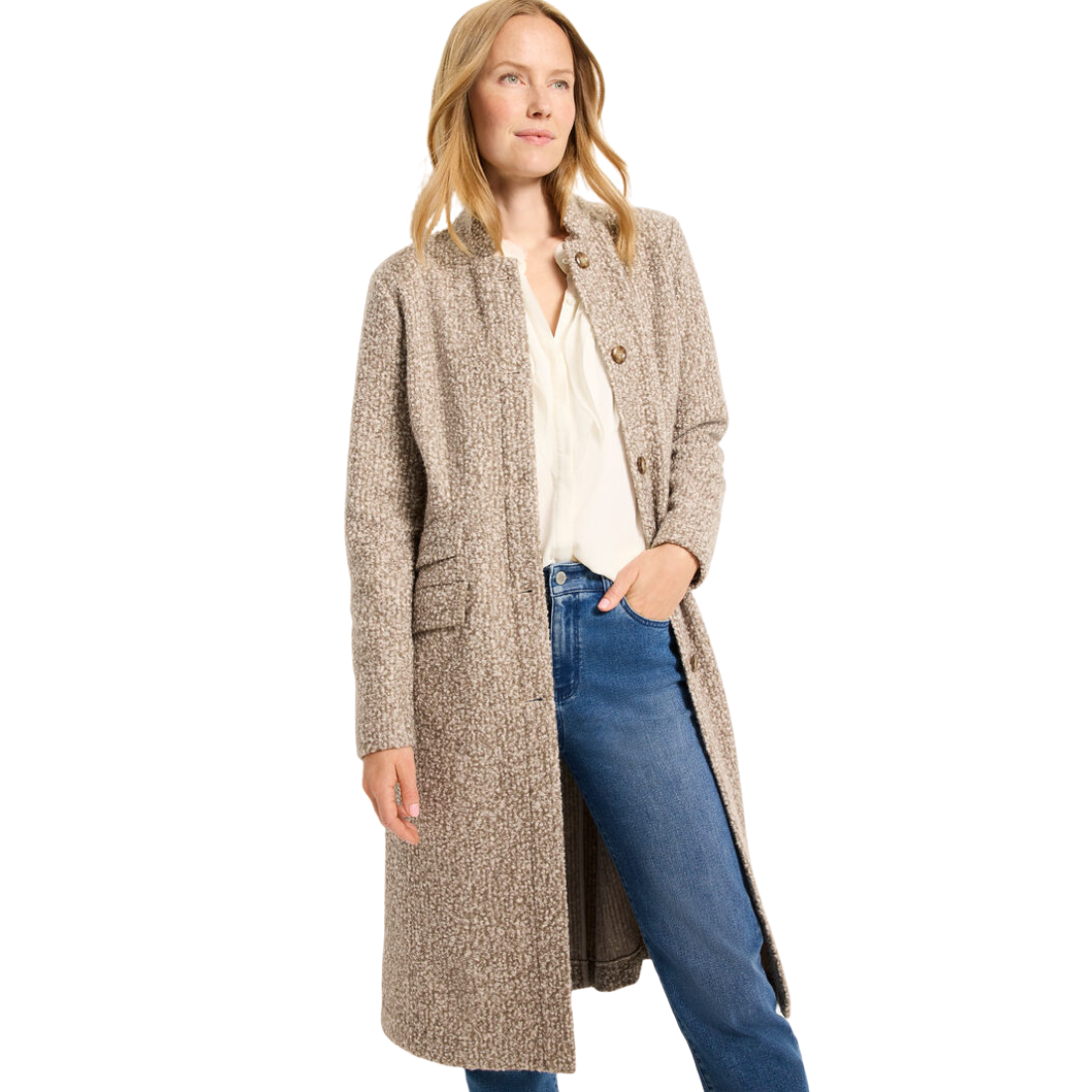 Classic meets comfort in the Sherpa Tweed Knit Topcoat -- a refined layer with the look of traditional wool and the ease of a soft, stretch-infused knit, offering a lighter feel without sacrificing polish or comfort. The sleek, lapel-free silhouette is finished with a chic notch collar and flap pockets for understated sophistication. Unlined and designed to fall past the knee, it’s the effortless topcoat you’ll reach for when you want structure with a softer edge.