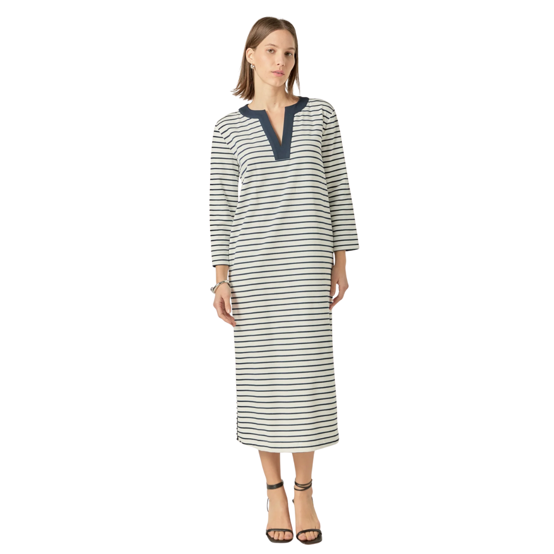 Make a stylish statement with the Sailor Stripe Jersey Midi Dress. Featuring classic stripes and a flattering V-neckline with rib detailing this dress is perfect for any occasion. The long sleeves provide coverage while the side slit at the bottom adds a touch of femininity. Made from comfortable jersey fabric this dress is both chic and comfortable. Perfect for any season you can dress it up or down for a versatile look.