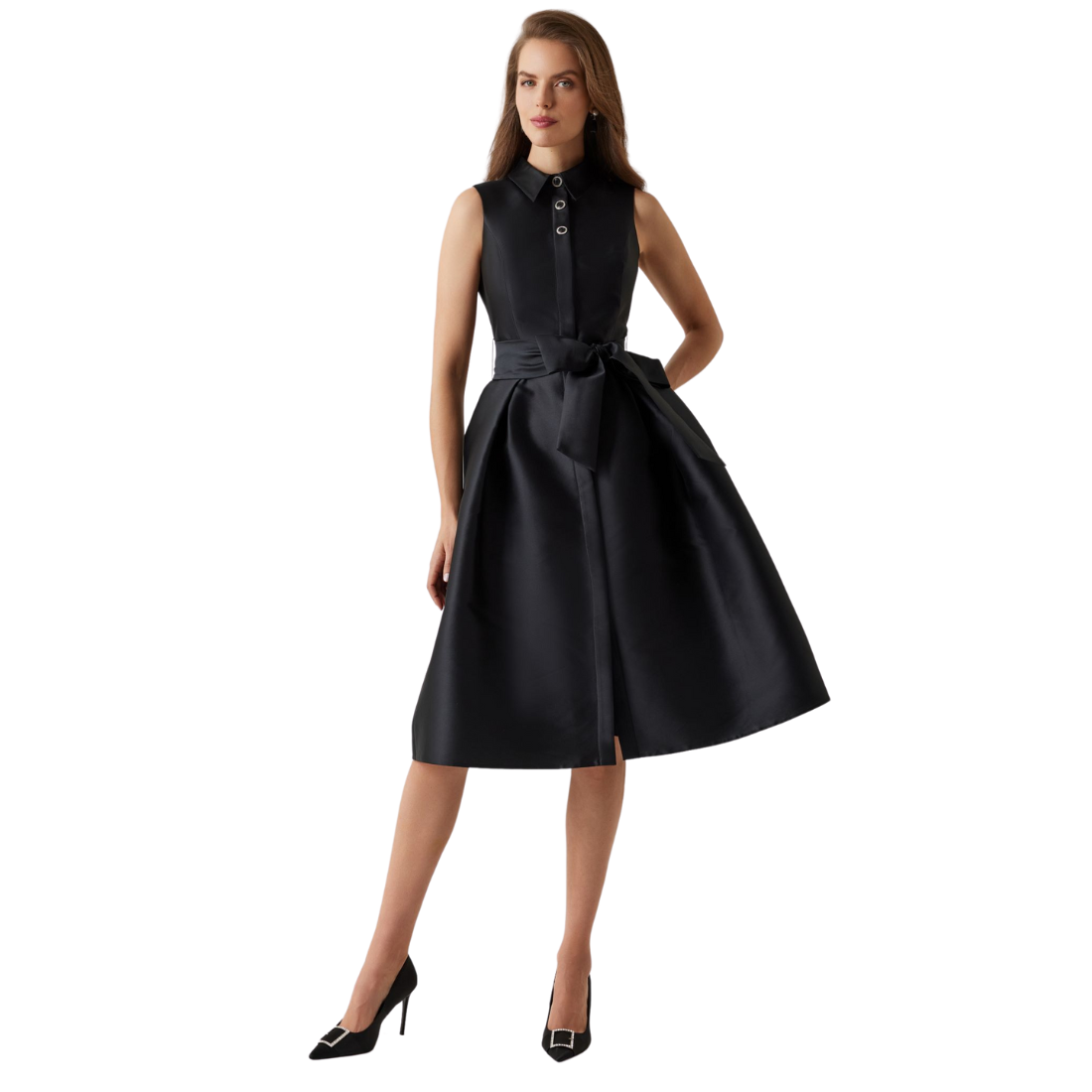 Chic and structured, this sleeveless Mikado shirt dress is a modern wardrobe essential. Featuring a sharp collar neckline and a tailored silhouette, it’s finished with three elegant jewel buttons that add a refined touch. The removable belt cinches the waist for a flattering fit, offering versatility in styling. Crafted in sleek black Mikado fabric, this dress transitions effortlessly from daytime events to evening occasions with timeless sophistication.