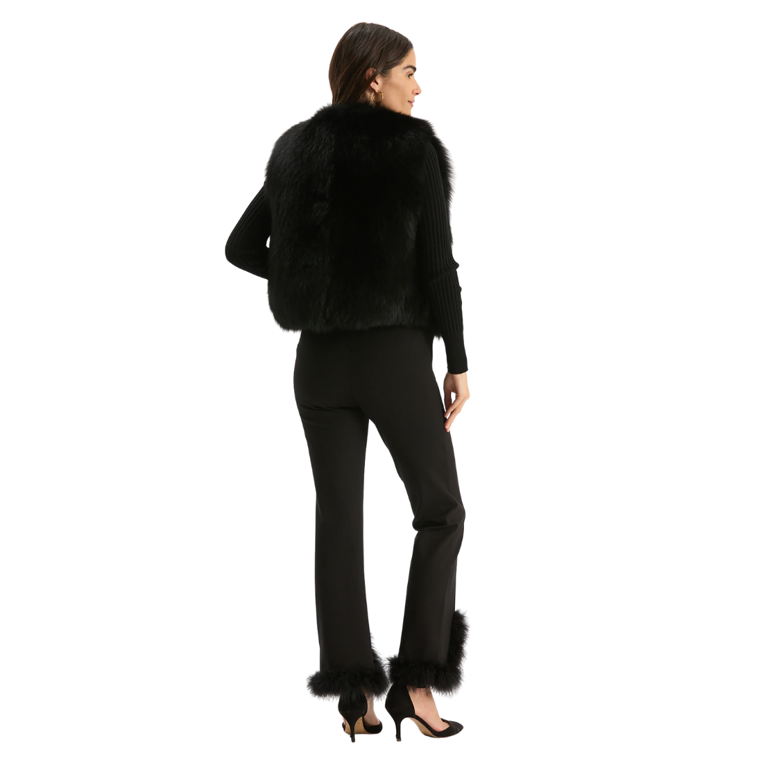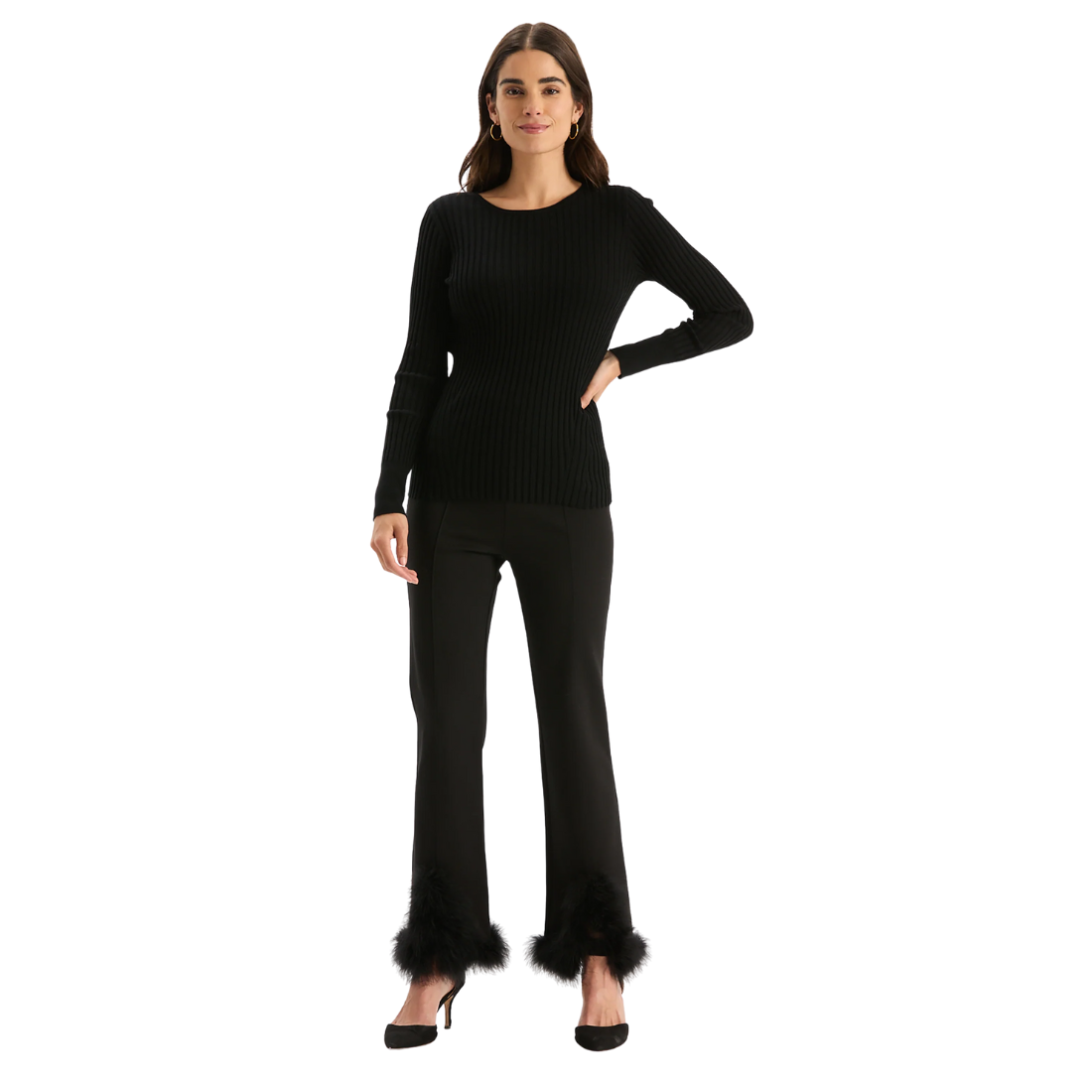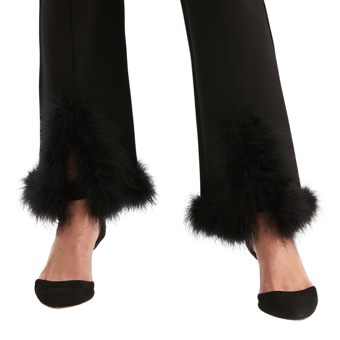 This flattering pant features a sleek, slim leg silhouette crafted from luxuriously soft and stretchy ponte knit fabric. The showstopping detail? Feather trim at the hem, adding texture and a hint of glamour to every step. Perfect for holiday soirées or cocktail parties, the Ameret blends comfort with statement style. The pull-on waistband ensures a smooth fit, while the high-rise cut flatters the figure and elongates the legs.