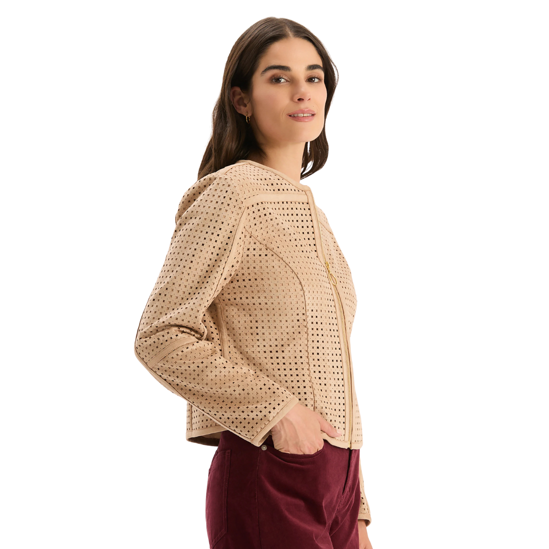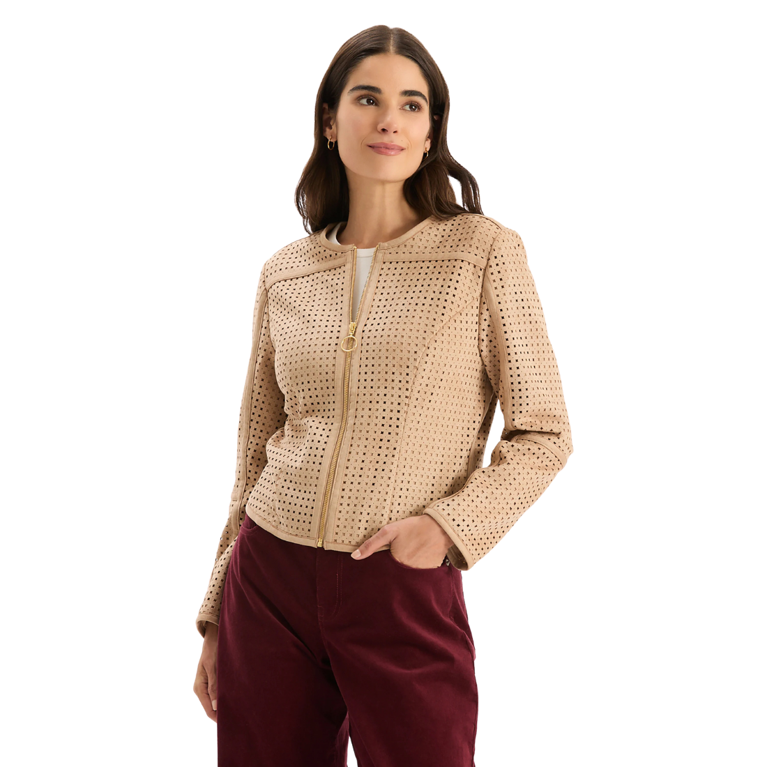 Crafted in soft faux suede fabric, the Piper Punched Faux Suede Jacket has a luxurious feel and contemporary edge. The silhouette features a collarless design, gold zip-front closure, and allover perforated detailing that adds textural interest and modern flair. Perfect for pairing with everything from jeans to dresses, it brings just the right amount of polish to any outfit.