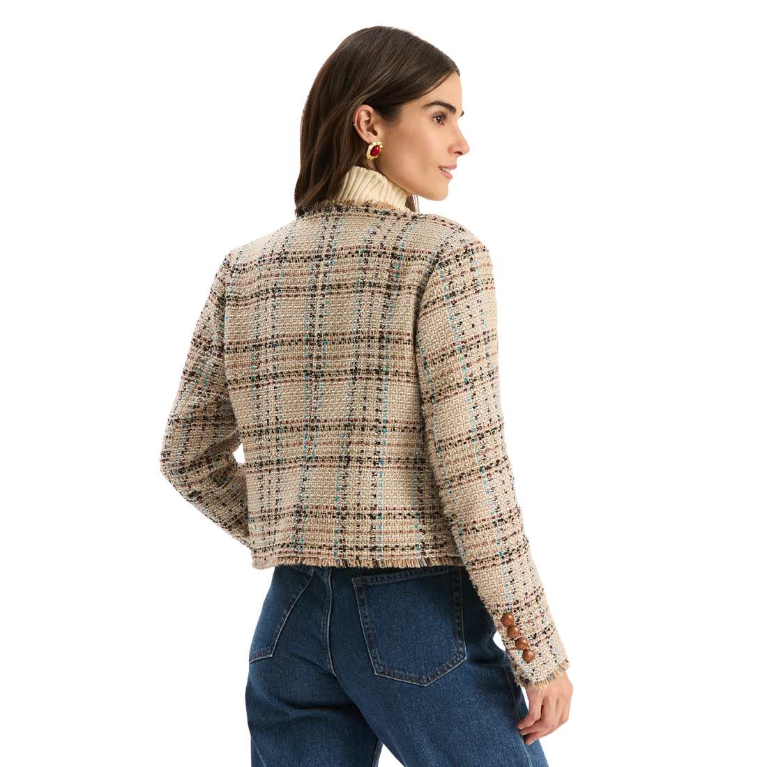 Crafted in textured bouclé fabric, the Randy Hyland Bouclé Jacket has a sophisticated tweed-inspired finish with timeless appeal. This style features a collarless design, button-front closure with oversized buttons, and frayed trim detailing that adds a modern twist. Its boxy, cropped cut layers effortlessly over turtlenecks, blouses, and dresses. Whether styled for the office or a weekend outing, it’s the chic statement jacket your wardrobe has been waiting for.