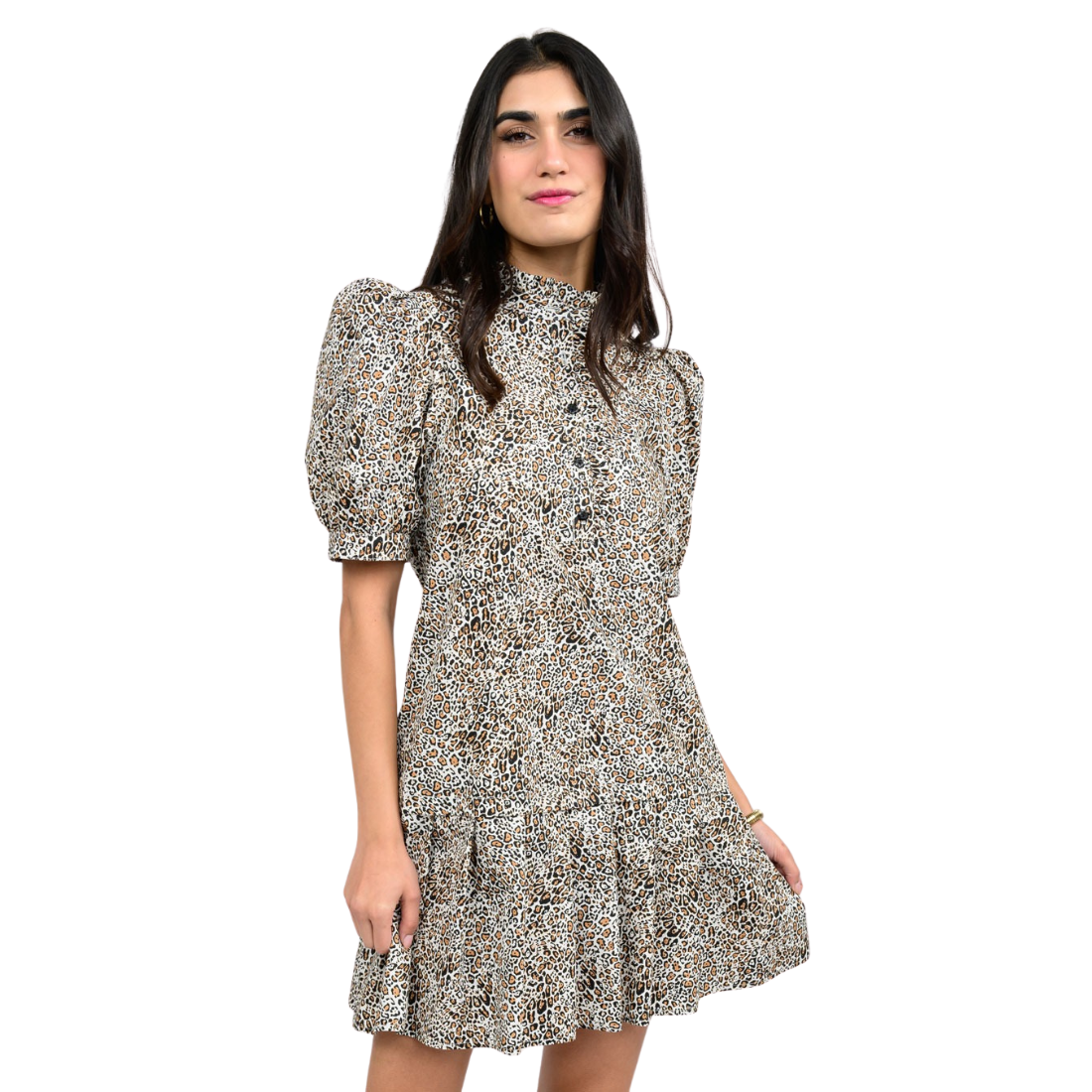 Embrace wild charm with the Uncle Frank Leopard Pleated Dress. Featuring playful puff sleeves and a ruffled hem and collar, this dress adds a flirty touch to your look. The 3/4 button-up front combines style with ease, making it perfect for any fun outing or casual day. Let your bold side roam free!
