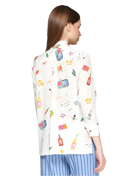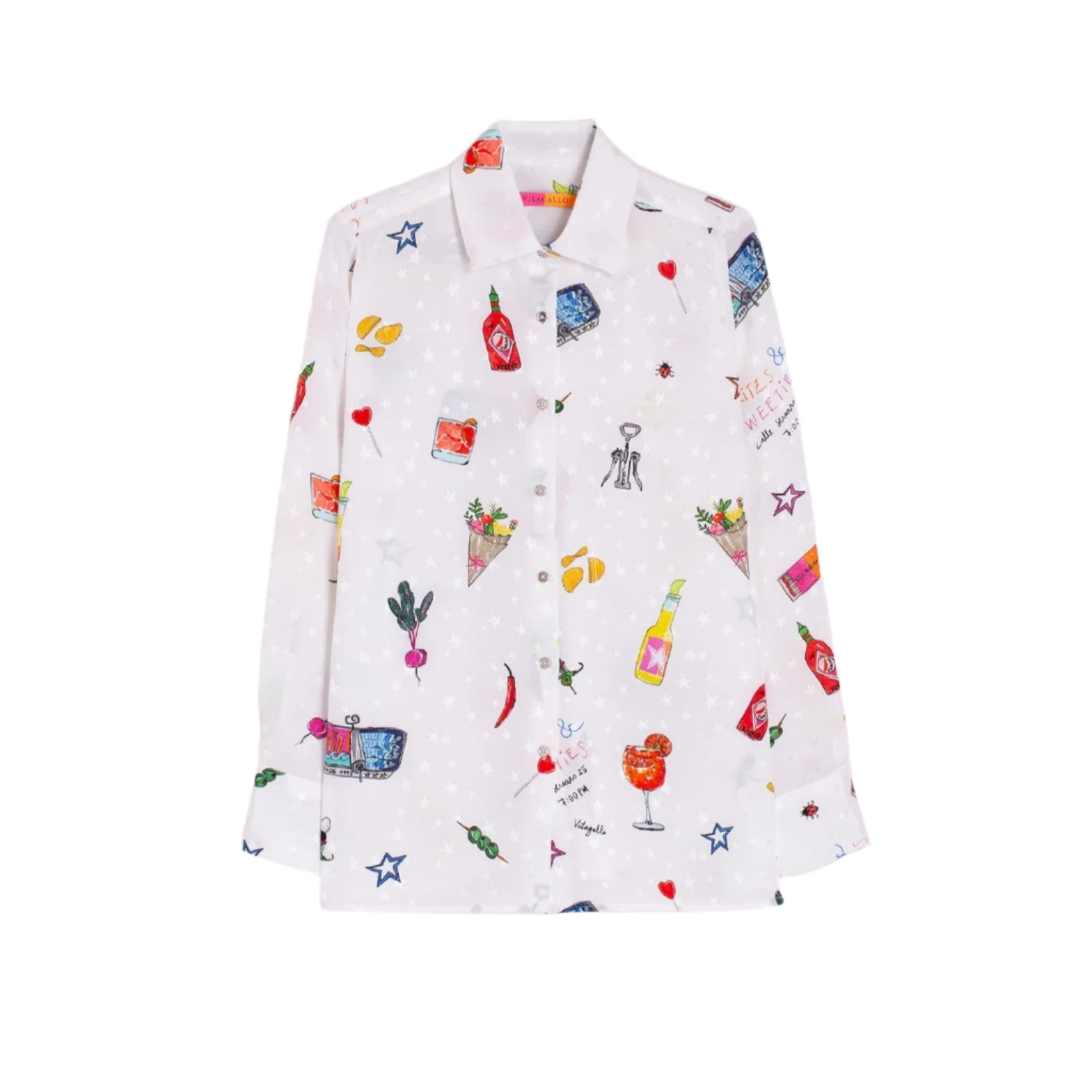 Flowing white shirt with jacquard stars and printed with exclusive Vilagallo snack patterns. Front fastening with metal shirt buttons. Long sleeves with cuffs.